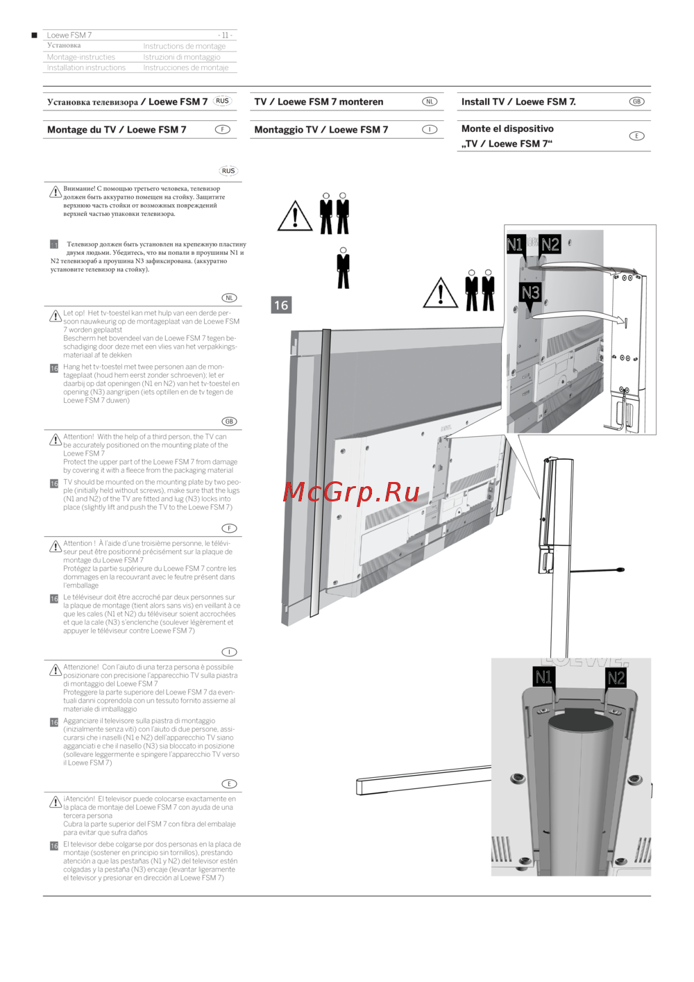 (N1 and N2) of the TV are fitted and lug (N3) locks into