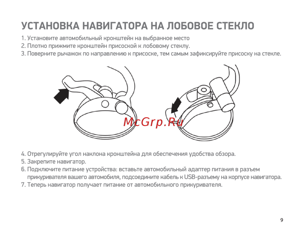 УСТАНОВКА НАВИГАТОРА НА ЛОБОВОЕ СТЕКЛО 1 Установите автомобильный кронштейн на выбранное место 2 Плотно прижмите кронштейн присоской к лобовому стеклу 3 Поверните рычажок по направлению к присоске тем самым зафиксируйте присоску на стекле 4 Отрегулируйте угол наклона кронштейна для обеспечения удобства обзора 5 Закрепите навигатор 6 Подключите питание устройства вставьте автомобильный адаптер питания в разъем прикуривателя вашего автомобиля подсоедините кабель к и5В разъему на корпусе навигатора 7 Теперь навигатор получает питание от автомобильного прикуривателя 9