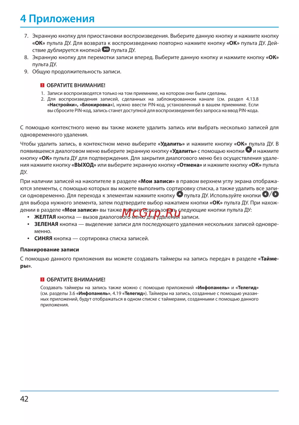 1. Записи воспроизводятся только на том приемнике, на котором они были сделаны.