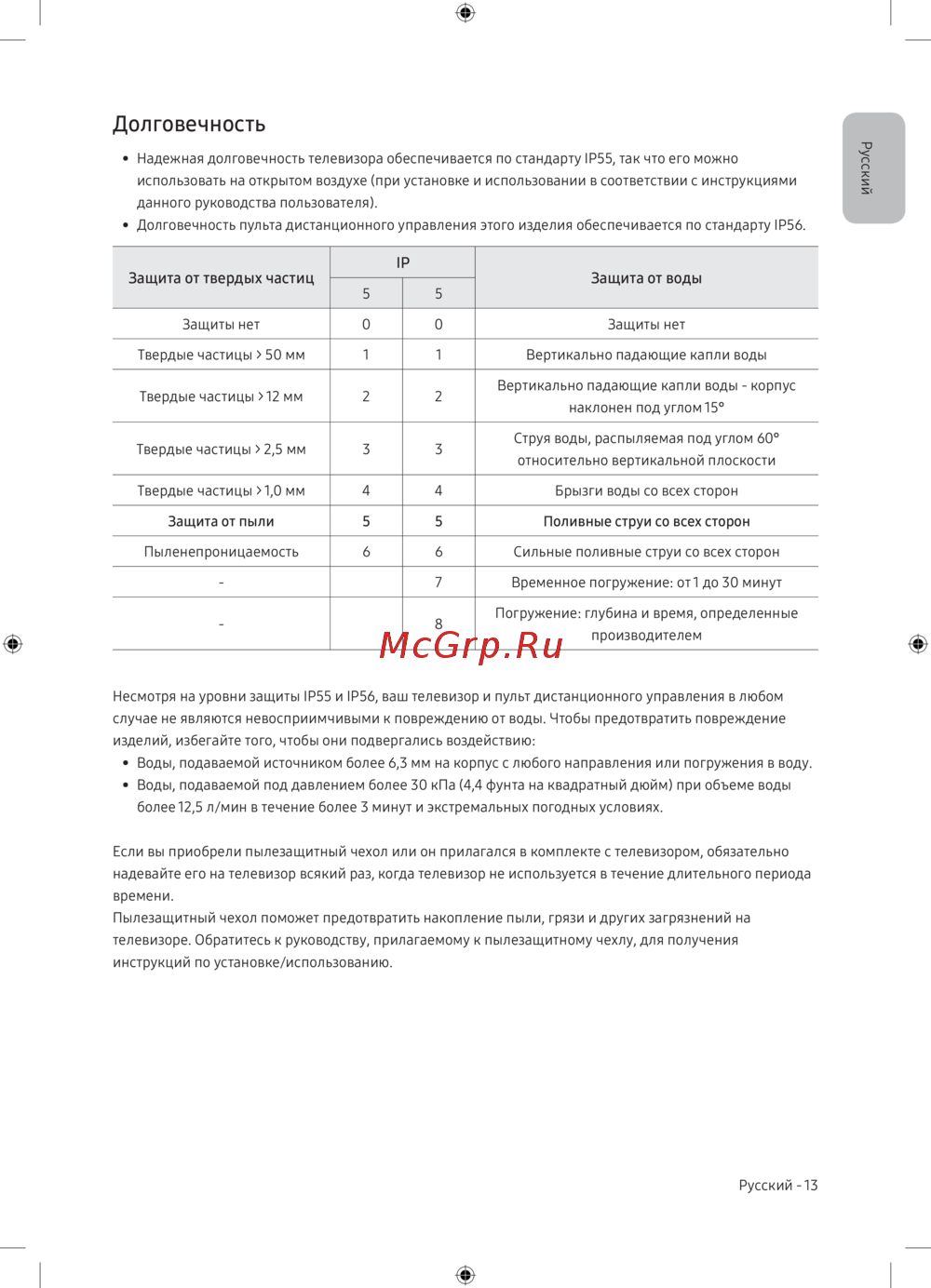 Samsung QE55LST7TAU [13/56] Защита от твердых частиц ip защита от воды