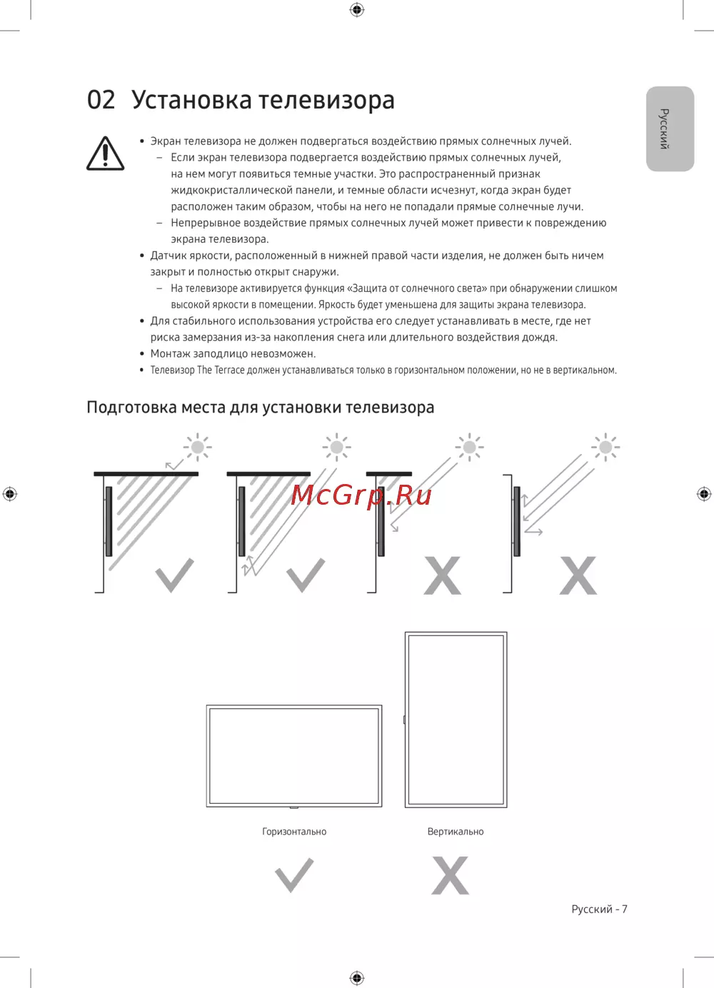 • Телевизор The Terrace должен устанавливаться только в горизонтальном положении, но не в вертикальном.
