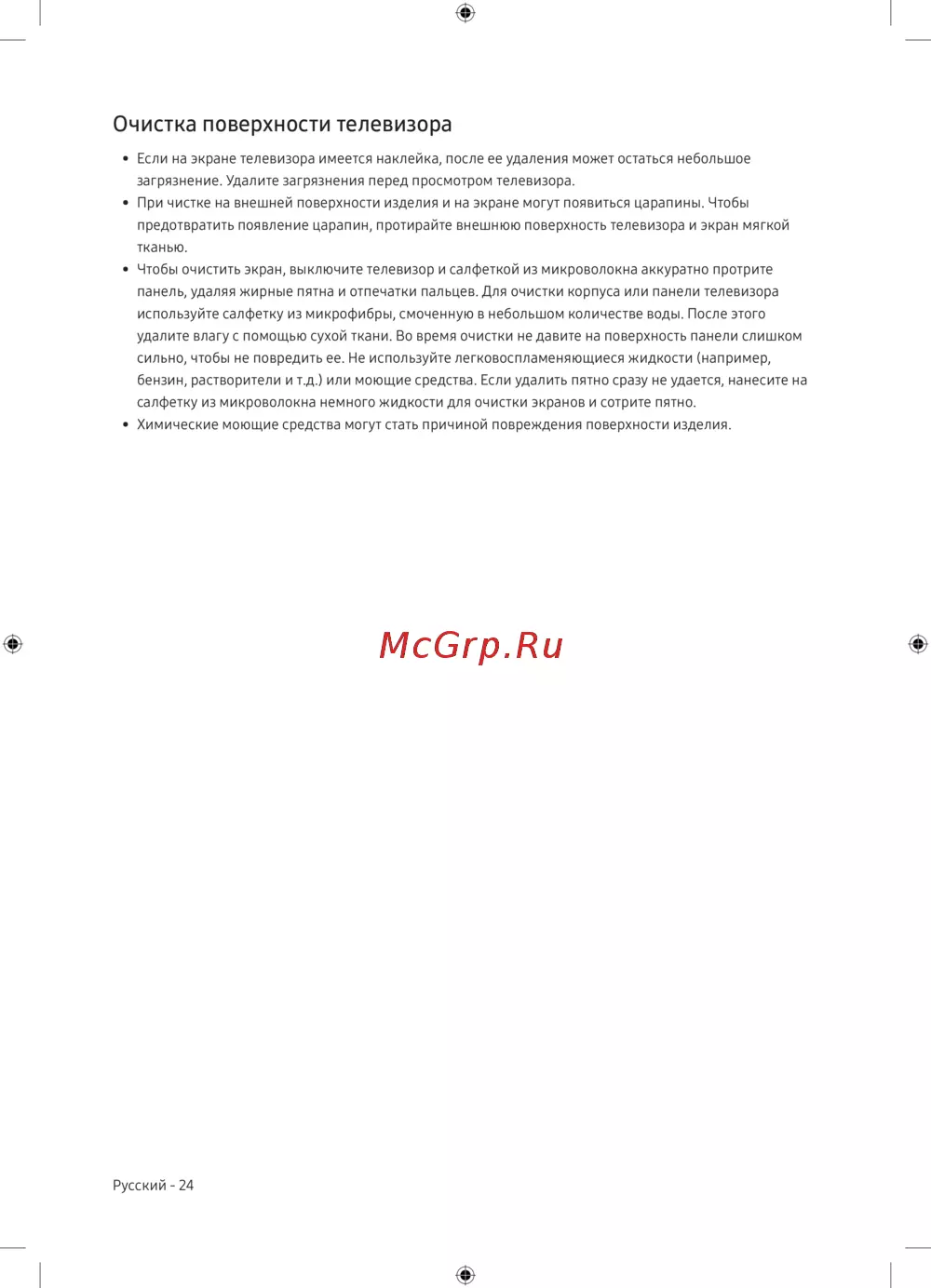 • При чистке на внешней поверхности изделия и на экране могут появиться царапины. Чтобы