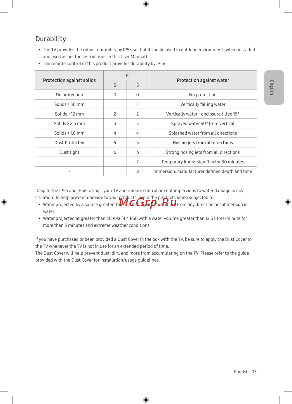 Samsung QE65LST7TAU [41/56] Protection against solids ip protection against water