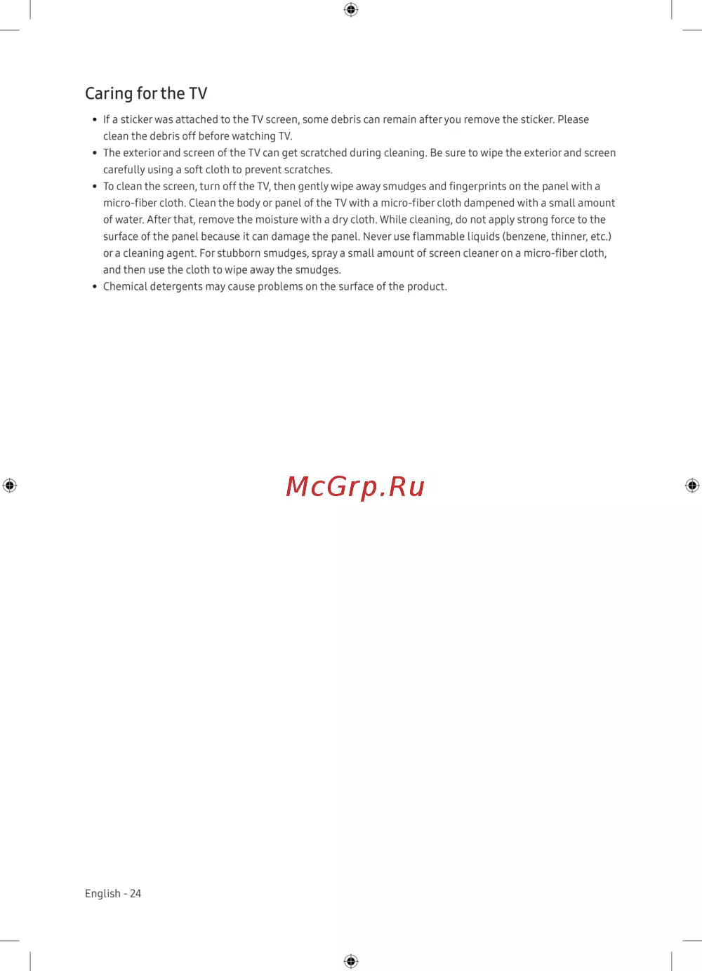 • The exterior and screen of the TV can get scratched during cleaning. Be sure to wipe the exterior and screen