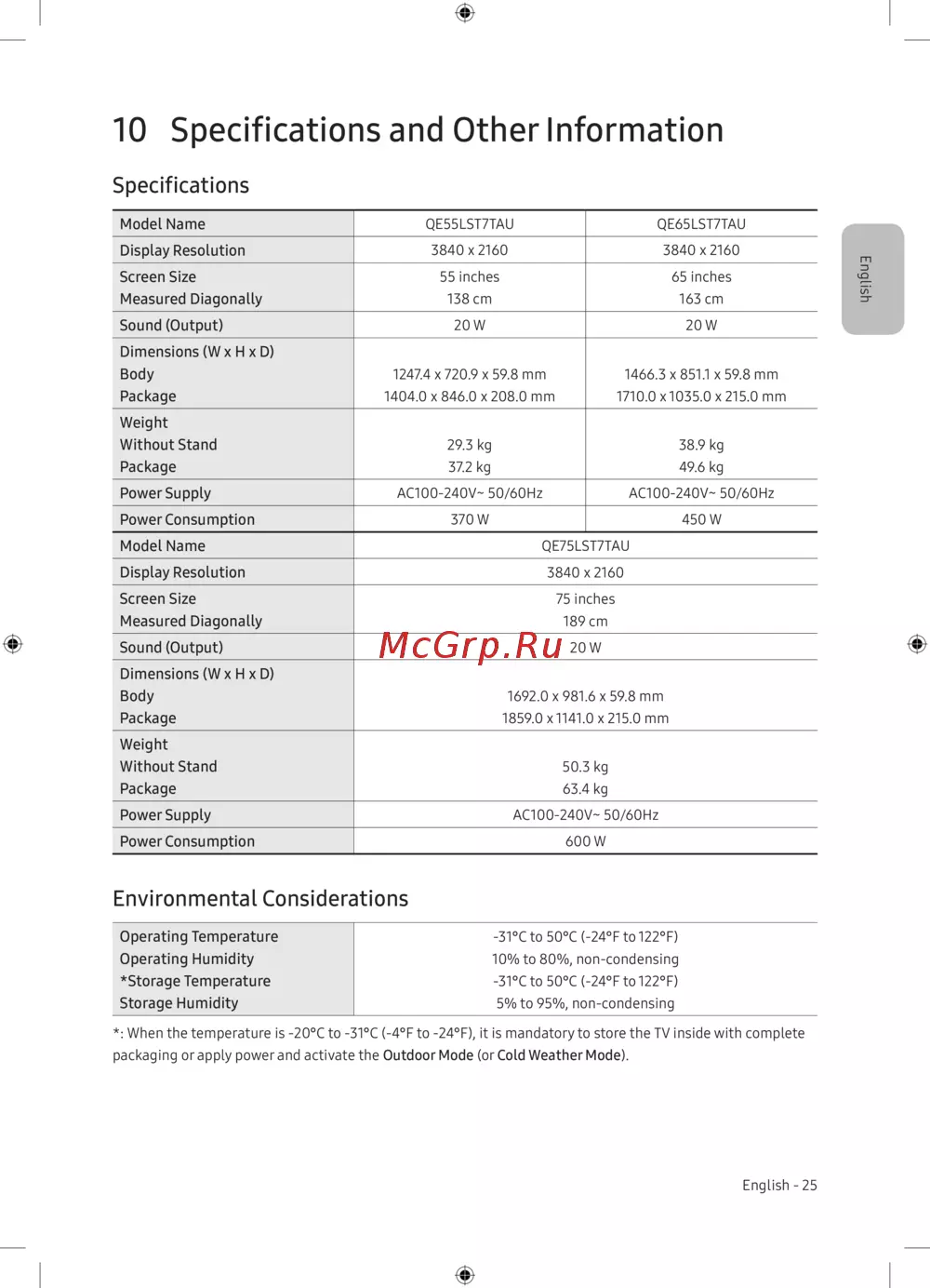 *: When the temperature is -20°C to -31°C (-4°F to -24°F), it is mandatory to store the TV inside with complete