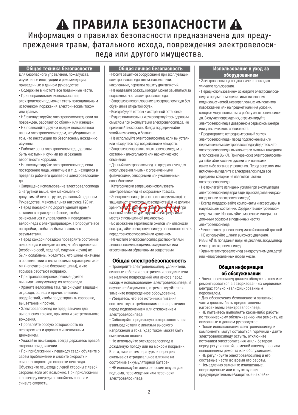 А ПРАВИЛА БЕЗОПАСНОСТИ А Информация о правилах безопасности предназначена для преду преждения травм фатального исхода повреждения электровелоси педа или другого имущества Общая техника безопасности Общая личная безопасность Использование и уход за оборудованием Для безопасного управления пожалуйста Носите защитное оборудование при эксплуатации изучите все инструкции и рекомендации электровелосипеда шлем налокотники Электровелосипед предназначен только для приведенные в данном руководстве наколенники перчатки защиту для запястий уличного пользования Содержите в чистоте все подвижные части Не надевайте одежду которая может зацепиться за Перед использованием осмотрите электровелоси При неправильном использовании подвижные части электровелосипеда пед на предмет смещения или связывания электровелосипед может стать потенциальным Запрещено использование электровелосипеда без подвижных частей незакрепленных компонентов источником поражения электрическим током обуви или в открытой обуви повреждений или на предмет наличия условий или травмы Всегда будьте готовы к экстренной остановке которые могут повлиять на работу электровелосипе НЕ эксплуатируйте электровелосипед если он Будьте внимательны и руководствуйтесь здравым да В случае повреждения отремонтируйте поврежден работает со сбоями или изношен смыслом при эксплуатации электровелосипеда Не электровелосипед в доверенном сервисном центре НЕ позволяйте другим людям пользоваться превышайте скорость Всегда поддерживайте или у технического специалиста вашим электровелосипедом не убедившись в устойчивую опору и баланс Предотвратите непреднамеренный запуск том что инструкции по безопасному вождению Не используйте электровелосипед если вы устали электровелосипеда перед подключением или изучены или находитесь под воздействием лекарств перемещением электровелосипеда убедитесь что Рабочие зоны электровелосипеда должны Запрещено управлять электровелосипедом в электровелосипед и выключатели питания находятся быть чистыми и сухими во избежание состоянии алкогольного или наркотического в положении ВЫКЛ При переноске электровелосипе вероятности коррозии опьянения да избегайте касания руками или пальцами Не эксплуатируйте электровелосипед если Данный электровелосипед не предназначен для каких либо органов управления Перед запуском или посторонние лица животные и т д находятся в использования лицами с ограниченными включением удалите с электровелосипеда все пределах рабочего диапазона электровелосипе физическими сенсорными или умственными предметы которые не являются частью да способностями электровелосипеда Запрещено использование электровелосипеда Категорически запрещено использовать Не прилагайте излишних усилий при эксплуатации с нагрузкой выше чем максимально электровелосипед на скоростных трассах электровелосипеда при езде при складывании рас допустимый вес нагрузки указанный в данном Электровелосипед в частности аккумулятор не кладывании электровелосипеда Руководстве Максимальная нагрузка 120 кг защищен от атмосферных воздействий и не должен Всегда поддерживайте компоненты и аксессуары в Перед поездкой по дороге уделите время храниться под прямыми солнечными лучами при надлежащем состоянии Содержите 
