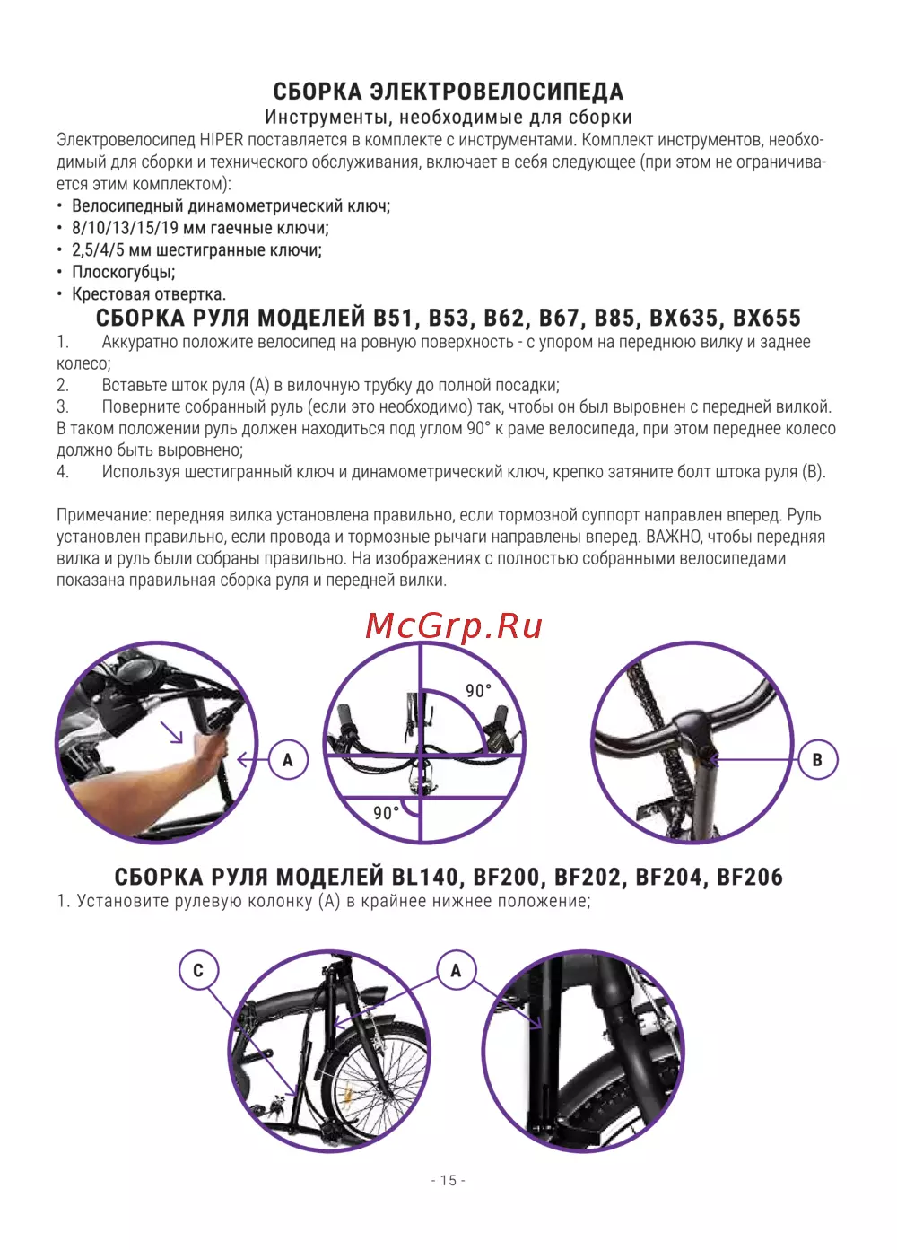 СБОРКА ЭЛЕКТРОВЕЛОСИПЕДА Инструменты необходимые для сборки Электровелосипед HIPER поставляется в комплекте с инструментами Комплект инструментов необхо димый для сборки и технического обслуживания включает в себя следующее при этом не ограничива ется этим комплектом Велосипедный динамометрический ключ 8 10 13 15 19 мм гаечные ключи 2 5 4 5 мм шестигранные ключи Плоскогубцы Крестовая отвертка СБОРКА РУЛЯ МОДЕЛЕЙ В51 В53 В62 В67 В85 ВХ635 ВХ655 1 Аккуратно положите велосипед на ровную поверхность с упором на переднюю вилку и заднее колесо 2 Вставьте шток руля А в вилочную трубку до полной посадки 3 Поверните собранный руль если это необходимо так чтобы он был выровнен с передней вилкой В таком положении руль должен находиться под углом 90 к раме велосипеда при этом переднее колесо должно быть выровнено 4 Используя шестигранный ключ и динамометрический ключ крепко затяните болт штока руля В Примечание передняя вилка установлена правильно если тормозной суппорт направлен вперед Руль установлен правильно если провода и тормозные рычаги направлены вперед ВАЖНО чтобы передняя вилка и руль были собраны правильно На изображениях с полностью собранными велосипедами показана правильная сборка руля и передней вилки СБОРКА РУЛЯ МОДЕЛЕЙ ВЫ40 ВЕ200 ВЕ202 ВЕ204 ВЕ206 1 Установите рулевую колонку А в крайнее нижнее положение 15