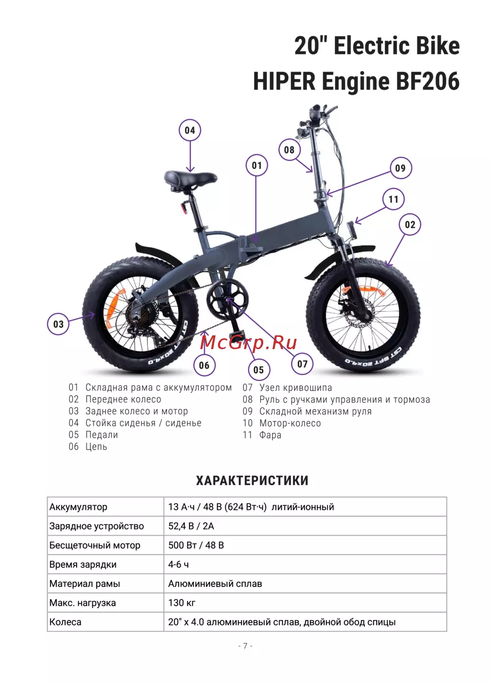 20 Electric Bike HIPER Engine BF206 01 Складная рама саккумулятором 07 02 Переднее колесо 03 Заднее колесо и мотор 04 Стойка сиденья сиденье 05 Педали 06 Цепь Узел кривошипа 08 Руль с ручками управления и тормоза 09 Складной механизм руля 10 Мотор колесо 11 Фара ХАРАКТЕРИСТИКИ Аккумулятор 13 А ч 48 В 624 Вт ч литий ионный Зарядное устройство 52 4 В 2А Бесщеточный мотор 500 Вт 48 В Время зарядки 4 6 ч Материал рамы Алюминиевый сплав Макс нагрузка 130 кг Колеса 20 х 4 0 алюминиевый сплав двойной обод спицы 7