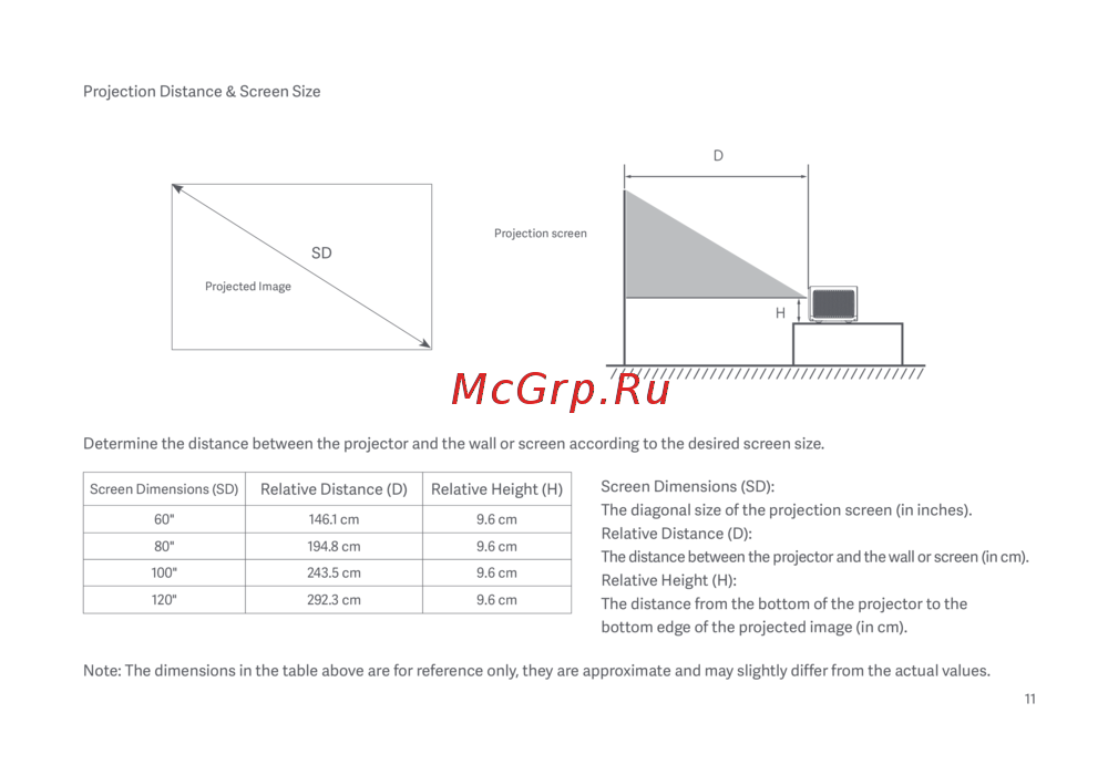 - Relative höhe h der abstand zwischen der unterseite des projektors und dem unteren rand des projektierten bildes cm p.31