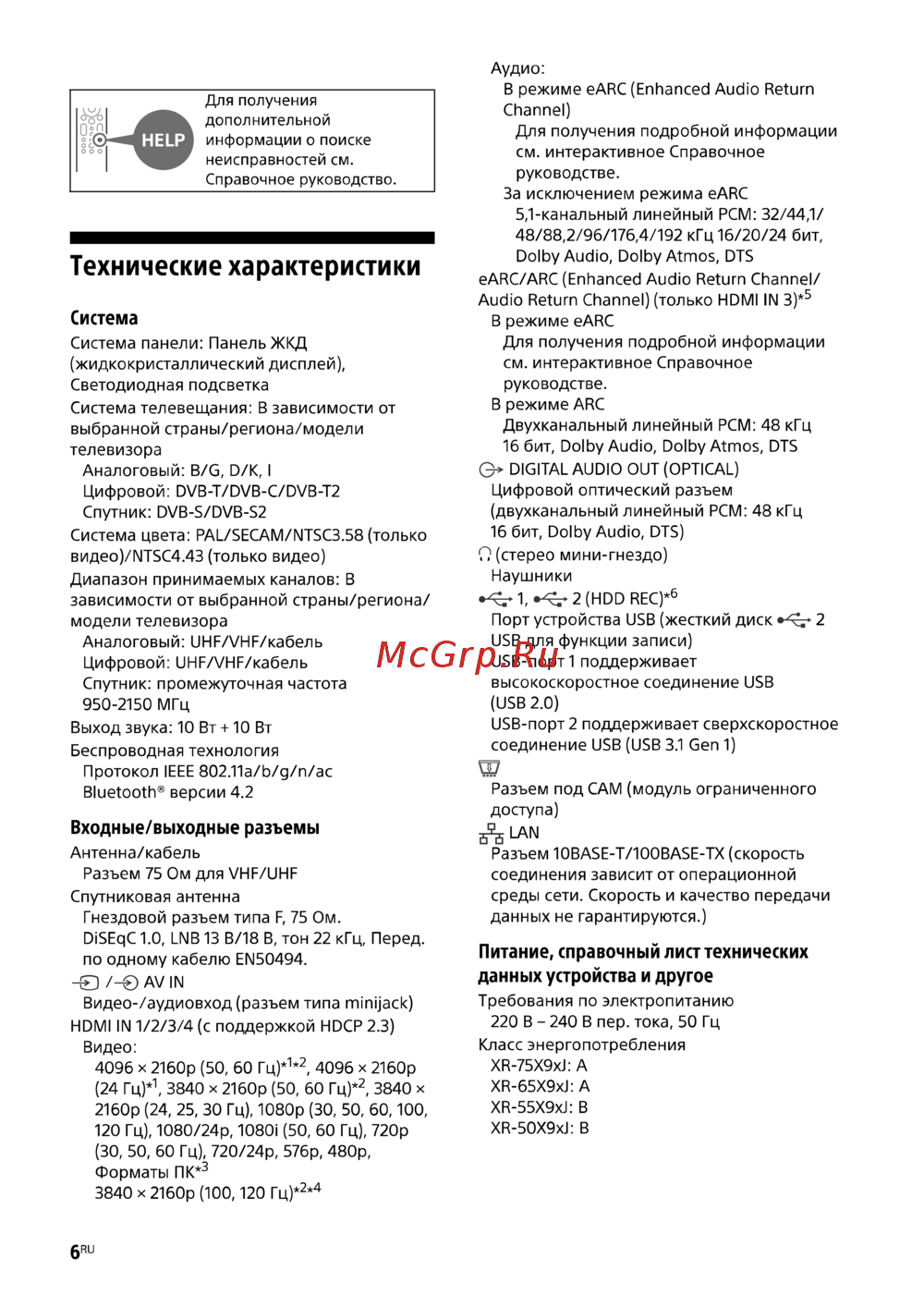 Для получения дополнительной информации о поиске неисправностей см Справочное руководство Технические характеристики Система Система панели Панель ЖКД жидкокристаллический дисплей Светодиодная подсветка Система телевещания В зависимости от выбранной страны региона модели телевизора Аналоговый B G D К I Цифровой DVB T DVB C DVB T2 Спутник DVB S DVB S2 Система цвета PAL SECAM NTSC3 58 только видео ЫТ5С4 43 только видео Диапазон принимаемых каналов В зависимости от выбранной страны региона модели телевизора Аналоговый UHF VHF кабель Цифровой UHF VHF кабель Спутник промежуточная частота 950 2150 МГц Выход звука 10 Вт 10 Вт Беспроводная технология Протокол IEEE 802 11a b g n ac Bluetooth версии 4 2 Входные выходные разъемы Антенна кабель Разъем 75 Ом для VHF UHF Спутниковая антенна Гнездовой разъем типа F 75 Ом DiSEqC 1 0 LNB 13 В 18 В тон 22 кГц Перед по одному кабелю EN50494 S 0 AV IN Видео аудиовход разъем типа minijack HDMI IN 1 2 3 4 с поддержкой HDCP 2 3 Видео 4096 х 2160р 50 60 Гц 1 2 4096 х 2160р 24 Гц 1 3840 х 2160р 50 60 Гц 2 3840 х 2160р 24 25 30 Гц 1080р 30 50 60 100 120 Гц 1080 24р 1080i 50 60 Гц 720р 30 50 60 Гц 720 24р 576р 480р Форматы ПК 3 3840 х 2160р 100 120 Гц 2 4 6RU Аудио В режиме eARC Enhanced Audio Return Channel Для получения подробной информации см интерактивное Справочное руководстве За исключением режима eARC 5 1 канальный линейный РСМ 32 44 1 48 88 2 96 176 4 192 кГц 16 20 24 бит Dolby Audio Dolby Atmos DTS eARC ARC Enhanced Audio Return Channel Audio Return Channel только HDMI IN 3 5 В режиме eARC Для получения подробной информации см интерактивное Справочное руководстве В режиме ARC Двухканальный линейный РСМ 48 кГц 16 бит Dolby Audio Dolby Atmos DTS О DIGITAL AUDIO OUT OPTICAL Цифровой оптический разъем двухканальный линейный РСМ 48 кГц 16 бит Dolby Audio DTS Q стерео мини гнездо Наушники 1 2 HDD REC 6 Порт устройства USB жесткий диск 2 USB для функции записи USB порт 1 поддерживает высокоскоростное соединение USB USB 2 0 USB порт 2 поддерживает сверхскоростное соединение USB USB 3 1 Gen 1 Разъем под САМ модуль ограниченного доступа LAN Разъем 10BASE T 100BASE TX скорость соединения зависит от операционной среды сети Скорость и качество передачи данных не гарантируются Питание справочный лист технических данных устройства и другое Требования по электропитанию 220 В 240 В пер тока 50 Гц Класс энергопотребления ХВ 75Х9х1 А ХВ 65Х9х1 А ХВ 55Х9х1 В ХВ 50Х9х1 В