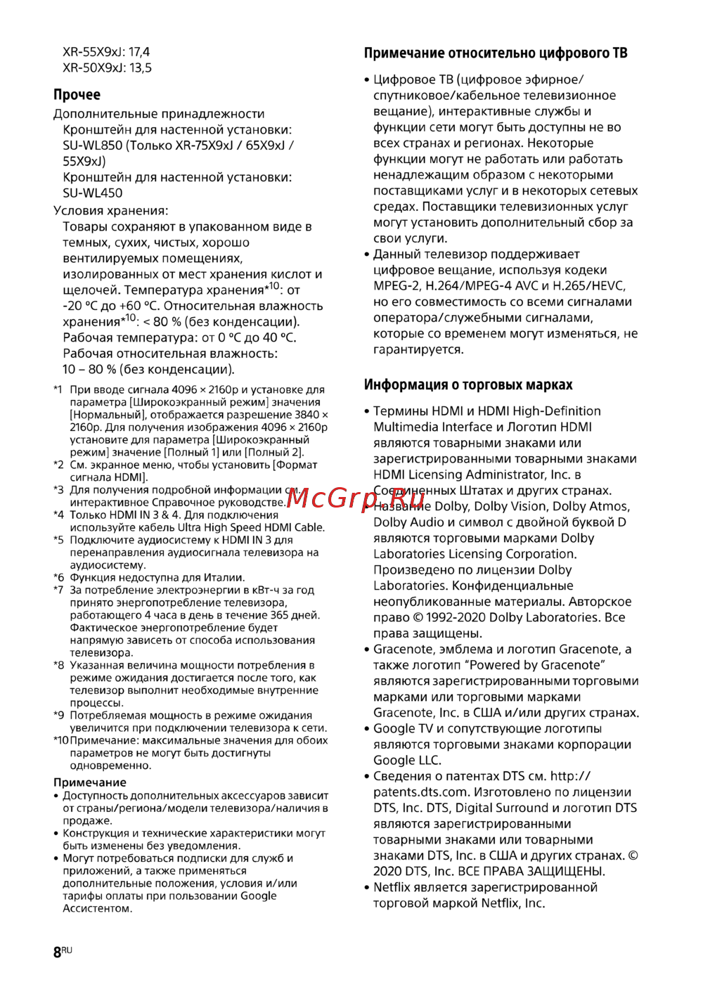 XR 55X9xJ 17 4 XR 50X9xJ 13 5 Прочее Дополнительные принадлежности Кронштейн для настенной установки SU WL850 Только XR 75X9xJ 65X9xJ 55X9xJ Кронштейн для настенной установки SU WL450 Условия хранения Товары сохраняют в упакованном виде в темных сухих чистых хорошо вентилируемых помещениях изолированных от мест хранения кислот и щелочей Температура хранения 10 от 20 C до 60 C Относительная влажность хранения 10 80 без конденсации Рабочая температура от 0 C до 40 C Рабочая относительная влажность 10 80 без конденсации 1 При вводе сигнала 4096 х 2160р и установке для параметра Широкоэкранный режим значения Нормальный отображается разрешение 3840 х 2160р Для получения изображения 4096 х 2160р установите для параметра Широкоэкранный режим значение Полный 1 или Полный 2 2 См экранное меню чтобы установить Формат сигнала HDMI 3 Для получения подробной информации см интерактивное Справочное руководстве 4 Только HDMI IN 3 4 Для подключения используйте кабель Ultra High Speed HDMI Cable 5 Подключите аудиосистему к HDMI IN 3 для перенаправления аудиосигнала телевизора на аудиосистему 6 Функция недоступна для Италии 7 За потребление электроэнергии в кВт ч за год принято энергопотребление телевизора работающего 4 часа в день в течение 365 дней Фактическое энергопотребление будет напрямую зависеть от способа использования телевизора 8 Указанная величина мощности потребления в режиме ожидания достигается после того как телевизор выполнит необходимые внутренние процессы 9 Потребляемая мощность в режиме ожидания увеличится при подключении телевизора к сети 10Примечание максимальные значения для обоих параметров не могут быть достигнуты одновременно Примечание Доступность дополнительных аксессуаров зависит от страны региона модели телевизора наличия в продаже Конструкция и технические характеристики могут быть изменены без уведомления Могут потребоваться подписки для служб и приложений а также применяться дополнительные положения условия и или тарифы оплаты при пользовании Google Ассистентом 8RU Примечание относительно цифрового ТВ Цифровое ТВ цифровое эфирное спутниковое кабельное телевизионное вещание интерактивные службы и функции сети могут быть доступны не во всех странах и регионах Некоторые функции могут не работать или работать ненадлежащим образом с некоторыми поставщиками услуг и в некоторых сетевых средах Поставщики телевизионных услуг могут установить дополнительный сбор за свои услуги Данный телевизор поддерживает цифровое вещание используя кодеки MPEG 2 H 264 MPEG 4 AVC и H 265 HEVC но его совместимость со всеми сигналами оператора служебными сигналами которые со временем могут изменяться не гарантируется Информация о торговых марках Термины HDMI и HDMI High Definition Multimedia Interface и Логотип HDMI являются товарными знаками или зарегистрированными товарными знаками HDMI Licensing Administrator Inc в Соединенных Штатах и других странах Название Dolby Dolby Vision Dolby Atmos Dolby Audio и символ с двойной буквой D являются торговыми марками Dolby Laboratories Licensing Corporation Произведено по лицензии Dolby Laboratories Конфиденциальные неопубликованные материалы Авторское право 1992 2020 Dolby Laboratories Все права защищены Gracenote эмблема и логотип Gracenote а также логотип Powered by Gracenote являются зарегистрированными торговыми марками или торговыми марками Gracenote Inc в США и или других странах Google TV и сопутствующие логотипы являются торговыми знаками корпорации Google LLC Свед