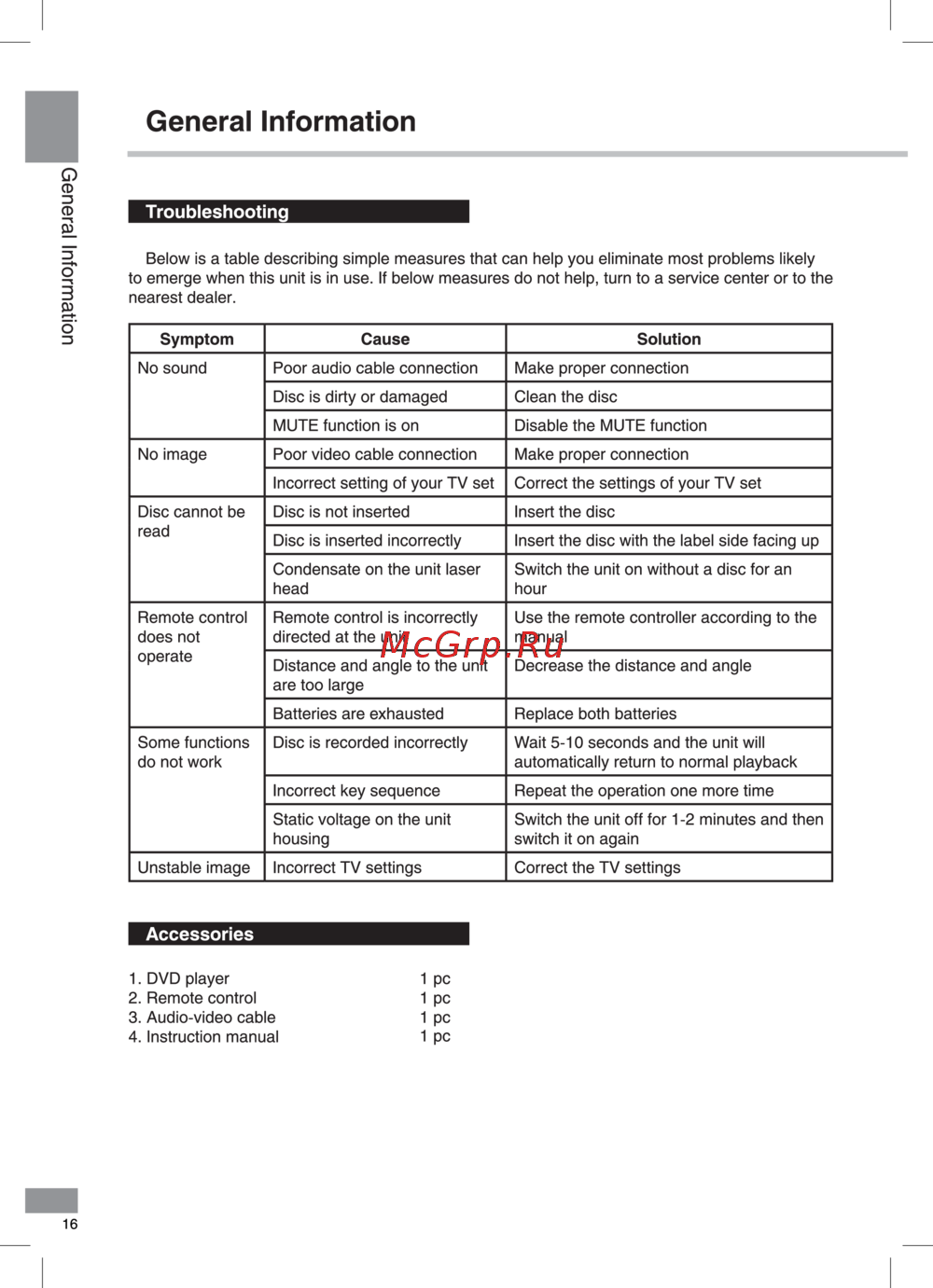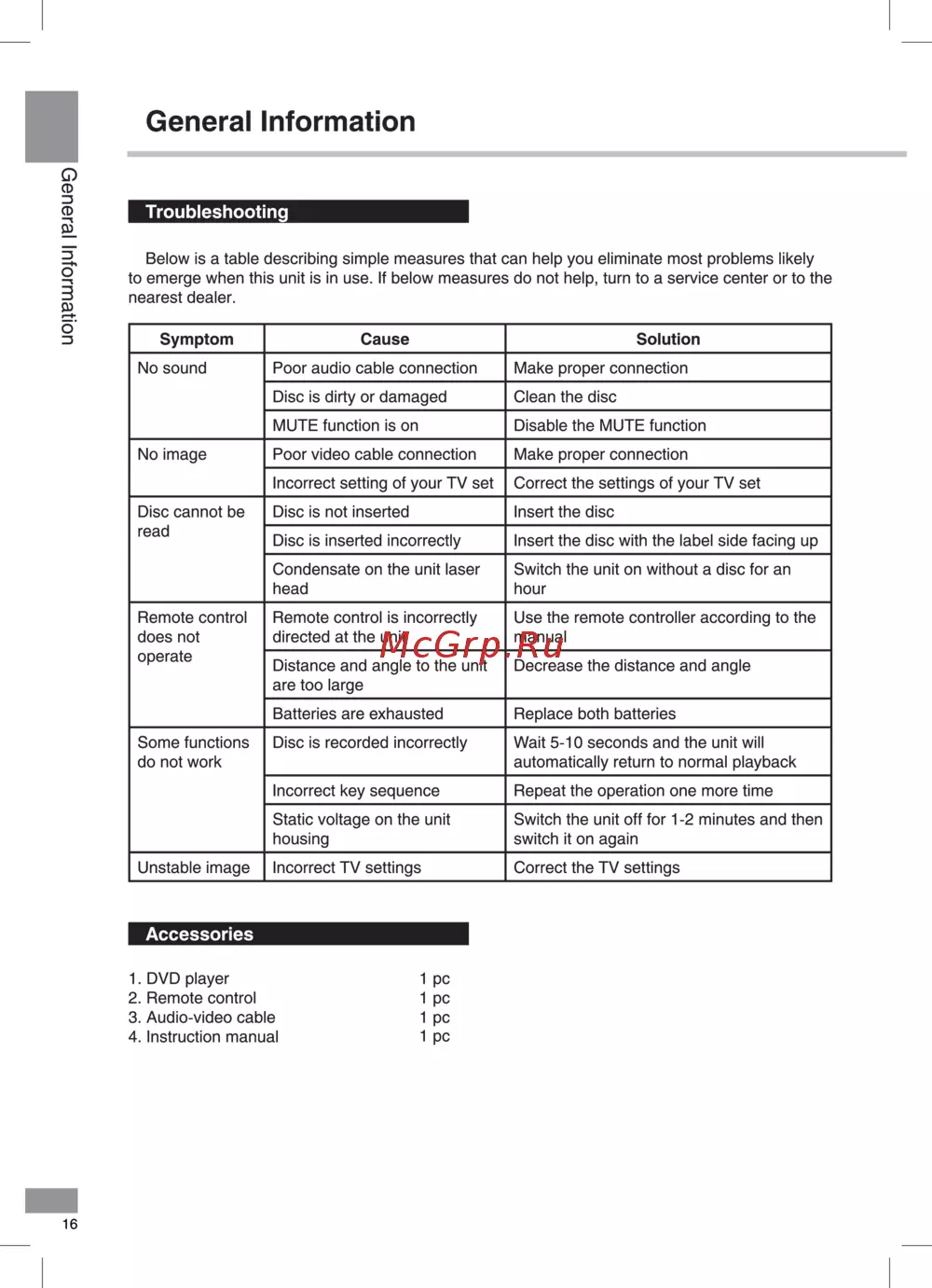 General Information General Information Troubleshooting Below is a table describing simple measures that can help you eliminate most problems likely to emerge when this unit is in use If below measures do not help turn to a service center or to the nearest dealer Symptom No sound No image Disc cannot be read Remote control does not operate Some functions do not work Unstable image Cause Solution Poor audio cable connection Make proper connection Disc is dirty or damaged Clean the disc MUTE function is on Disable the MUTE function Poor video cable connection Make proper connection Incorrect setting of your TV set Correct the settings of your TV set Disc is not inserted Insert the disc Disc is inserted incorrectly Insert the disc with the label side facing up Condensate on the unit laser head Switch the unit on without a disc for an hour Remote control is incorrectly directed at the unit Use the remote controller according to the manual Distance and angle to the unit are too large Decrease the distance and angle Batteries are exhausted Replace both batteries Disc is recorded incorrectly Wait 5 10 seconds and the unit will automatically return to normal playback Incorrect key sequence Repeat the operation one more time Static voltage on the unit housing Switch the unit off for 1 2 minutes and then switch it on again Incorrect TV settings Correct the TV settings Accessories 1 DVD player 2 Remote control 3 Audio video cable 4 Instruction manual 16 1 pc 1 pc 1 pc 1 pc