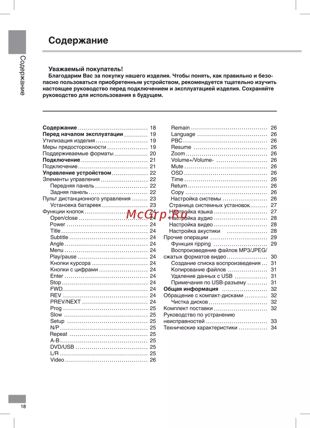 Содержание Ф Уважаемый покупатель Благодарим Вас за покупку нашего изделия Чтобы понять как правильно и безооз пасно пользоваться приобретенным устройством рекомендуется тщательно изучить н настоящее руководство перед подключением и эксплуатацией изделия Сохраняйте ф руководство для использования в будущем Содержание 18 Перед началом эксплуатации 19 Утилизация изделия 19 Меры предосторожности 19 Поддерживаемые форматы 20 Подключение 21 Подключение 21 Управление устройством 22 Элементы управления 22 Передняя панель 22 Задняя панель 22 Пульт дистанционного управления 23 Установка батареек 23 Функции кнопок 24 Open close 24 Power 24 Title 24 Subtitle 24 Angle 24 Menu 24 Play pause 24 Кнопки курсора 24 Кнопки с цифрами 24 Enter 24 Stop 24 FWD 24 REV 24 PREV NEXT 24 Prog 25 Slow 25 Setup 25 N P 25 Repeat 25 A B 25 DVD USB 25 L R 25 Video 26 18 Remain 26 Language 26 PBC 26 Resume 26 Zoom 26 Volume Volume 26 Mute 26 OSD 26 Time 26 Return 26 Copy 26 Настройка системы 26 Страница системных установок 27 Настройка языка 27 Настройка аудио 28 Настройка видео 28 Настройка акустики 28 Прочие операции 29 Функция ripping 29 Воспроизведение файлов MP3 JPEG сжатых форматов видео 30 Создание списка воспроизведения 31 Копирование файлов 31 Удаление данных с USB 31 Примечания по USB разъему 31 Общая информация 32 Обращение с компакт дисками 32 Чистка дисков 32 Комплект поставки 32 Руководство по устранению неисправностей 33 Технические характеристики 34