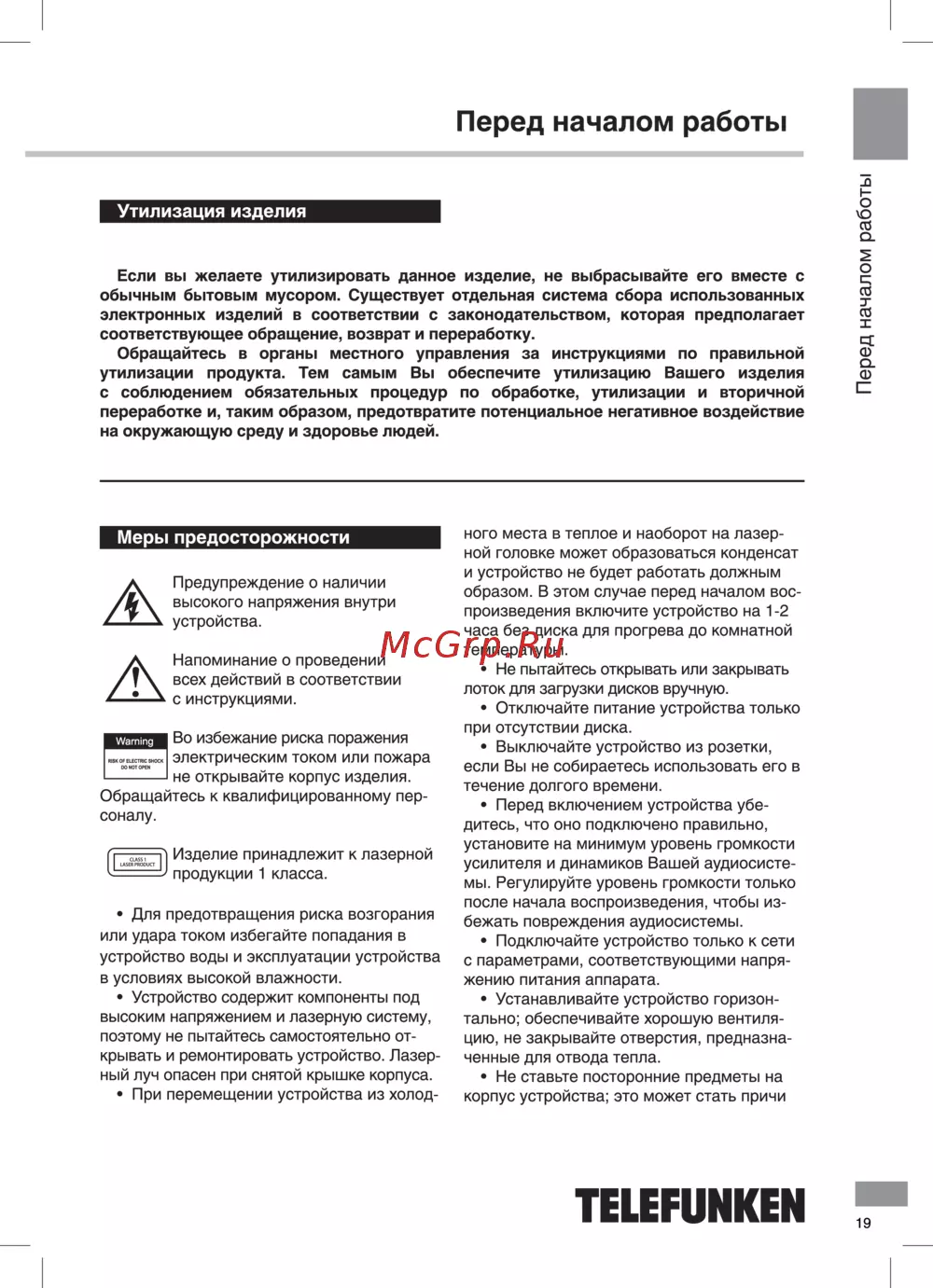 Утилизация изделия Если вы желаете утилизировать данное изделие не выбрасывайте его вместе с обычным бытовым мусором Существует отдельная система сбора использованных электронных изделий в соответствии с законодательством которая предполагает соответствующее обращение возврат и переработку Обращайтесь в органы местного управления за инструкциями по правильной утилизации продукта Тем самым Вы обеспечите утилизацию Вашего изделия с соблюдением обязательных процедур по обработке утилизации и вторичной переработке и таким образом предотвратите потенциальное негативное воздействие на окружающую среду и здоровье людей Меры предосторожности Предупреждение о наличии высокого напряжения внутри устройства Напоминание о проведении всех действий в соответствии с инструкциями А Во избежание риска поражения электрическим током или пожара не открывайте корпус изделия Обращайтесь к квалифицированному пер соналу Warning Т Изделие принадлежит к лазерной продукции 1 класса Для предотвращения риска возгорания или удара током избегайте попадания в устройство воды и эксплуатации устройства в условиях высокой влажности Устройство содержит компоненты под высоким напряжением и лазерную систему поэтому не пытайтесь самостоятельно от крывать и ремонтировать устройство Лазер ный луч опасен при снятой крышке корпуса При перемещении устройства из холод ного места в теплое и наоборот на лазер ной головке может образоваться конденсат и устройство не будет работать должным образом В этом случае перед началом вос произведения включите устройство на 1 2 часа без диска для прогрева до комнатной температуры Не пытайтесь открывать или закрывать лоток для загрузки дисков вручную Отключайте питание устройства только при отсутствии диска Выключайте устройство из розетки если Вы не собираетесь использовать его в течение долгого времени Перед включением устройства убе дитесь что оно подключено правильно установите на минимум уровень громкости усилителя и динамиков Вашей аудиосисте мы Регулируйте уровень громкости только после начала воспроизведения чтобы из бежать повреждения аудиосистемы Подключайте устройство только к сети с параметрами соответствующими напря жению питания аппарата Устанавливайте устройство горизон тально обеспечивайте хорошую вентиля цию не закрывайте отверстия предназна ченные для отвода тепла Не ставьте посторонние предметы на корпус устройства это может стать причи TELEFUNKEN Перед началом работы Перед началом работы