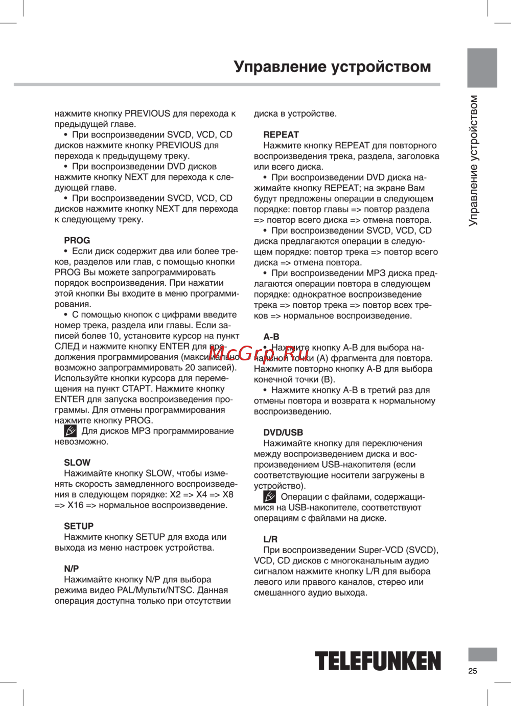 нажмите кнопку PREVIOUS для перехода к предыдущей главе При воспроизведении SVCD VCD CD дисков нажмите кнопку PREVIOUS для перехода к предыдущему треку При воспроизведении DVD дисков нажмите кнопку NEXT для перехода к сле дующей главе При воспроизведении SVCD VCD CD дисков нажмите кнопку NEXT для перехода к следующему треку PROG Если диск содержит два или более тре ков разделов или глав с помощью кнопки PROG Вы можете запрограммировать порядок воспроизведения При нажатии этой кнопки Вы входите в меню программи рования С помощью кнопок с цифрами введите номер трека раздела или главы Если за писей более 10 установите курсор на пункт СЛЕД и нажмите кнопку ENTER для про должения программирования максимально возможно запрограммировать 20 записей Используйте кнопки курсора для переме щения на пункт СТАРТ Нажмите кнопку ENTER для запуска воспроизведения про граммы Для отмены программирования нажмите кнопку PROG Для дисков MP3 программирование невозможно SLOW Нажимайте кнопку SLOW чтобы изме нять скорость замедленного воспроизведе ния в следующем порядке Х2 Х4 Х8 Х16 нормальное воспроизведение SETUP Нажмите кнопку SETUP для входа или выхода из меню настроек устройства N P Нажимайте кнопку N P для выбора режима видео PAL Мул ьти NTSC Данная операция доступна только при отсутствии диска в устройстве REPEAT Нажмите кнопку REPEAT для повторного воспроизведения трека раздела заголовка или всего диска При воспроизведении DVD диска на жимайте кнопку REPEAT на экране Вам будут предложены операции в следующем порядке повтор главы повтор раздела повтор всего диска отмена повтора При воспроизведении SVCD VCD CD диска предлагаются операции в следую щем порядке повтор трека повтор всего диска отмена повтора При воспроизведении MP3 диска пред лагаются операции повтора в следующем порядке однократное воспроизведение трека повтор трека повтор всех тре ков нормальное воспроизведение Управление устройством Управление устройством А В Нажмите кнопку A В для выбора на чальной точки А фрагмента для повтора Нажмите повторно кнопку A В для выбора конечной точки В Нажмите кнопку A В в третий раз для отмены повтора и возврата к нормальному воспроизведению DVD USB Нажимайте кнопку для переключения между воспроизведением диска и вос произведением USB накопителя если соответствующие носители загружены в устройство Операции с файлами содержащи мися на USB накопителе соответствуют операциям с файлами на диске L R При воспроизведении Super VCD SVCD VCD CD дисков с многоканальным аудио сигналом нажмите кнопку L R для выбора левого или правого каналов стерео или смешанного аудио выхода TELEFUNKEN 25