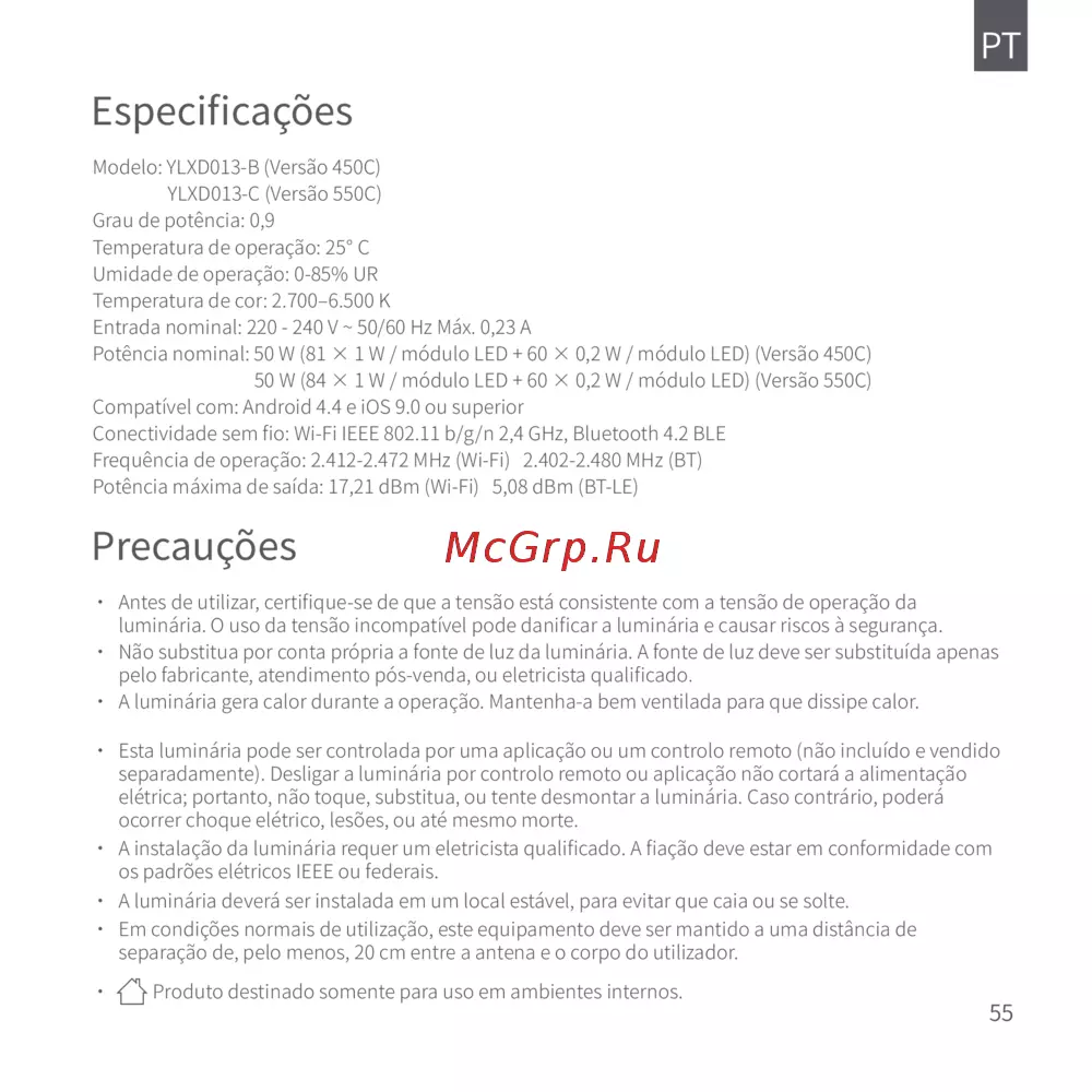 ・ Não substitua por conta própria a fonte de luz da luminária. A fonte de luz deve ser substituída apenas