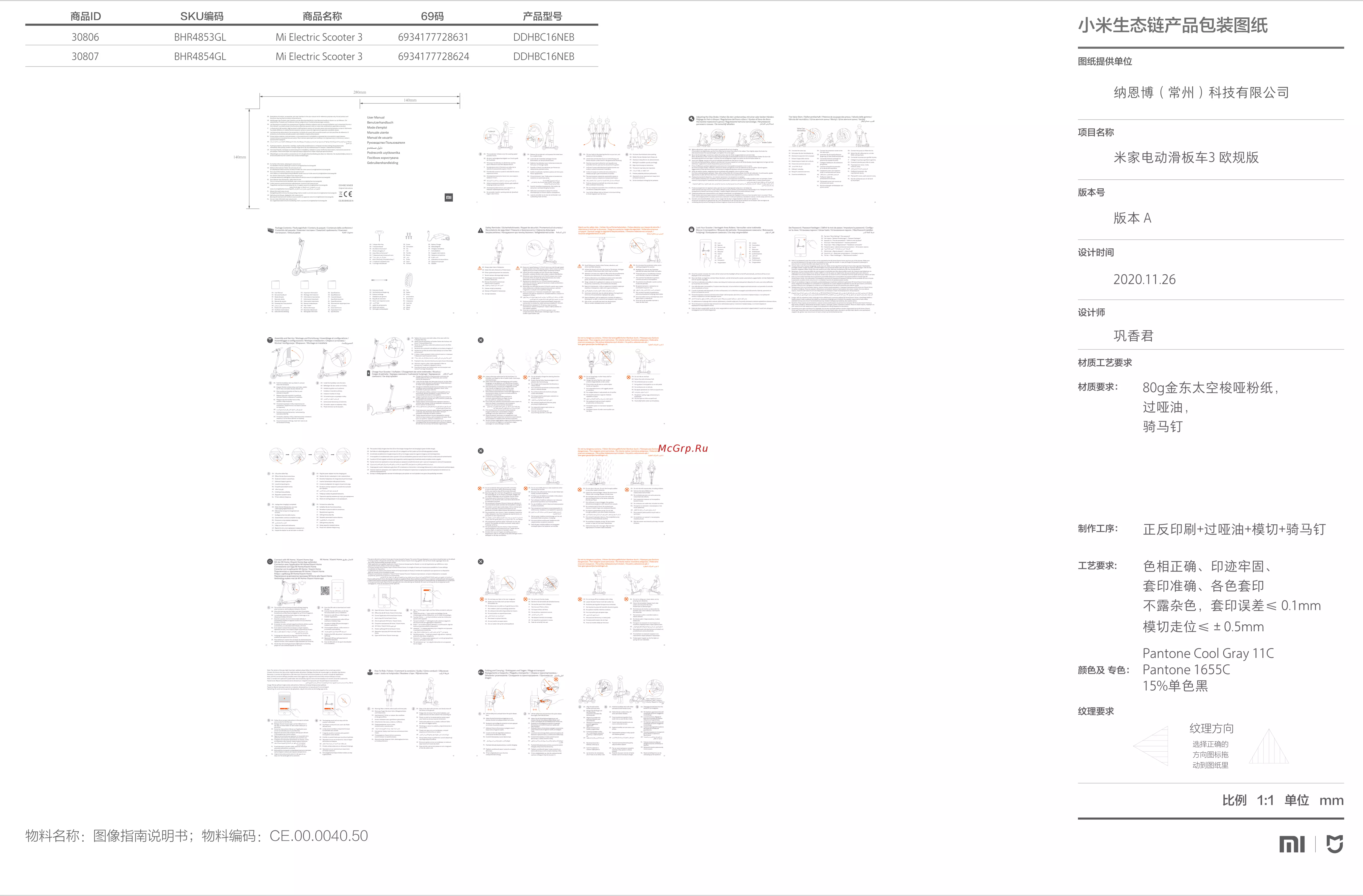 Xiaomi Mi Electric Scooter 3 (BHR4854GL) [15/15] 物料名称 图像指南说明书 物料编码 ce 0 040 0