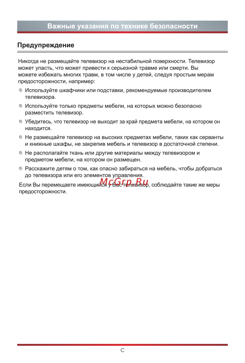 Важные указания по технике безопасности Предупреждение Никогда не размещайте телевизор на нестабильной поверхности Телевизор может упасть что может привести к серьезной травме или смерти Вы можете избежать многих травм в том числе у детей следуя простым мерам предосторожности например Используйте шкафчики или подставки рекомендуемые производителем телевизора Используйте только предметы мебели на которых можно безопасно разместить телевизор Убедитесь что телевизор не выходит за край предмета мебели на котором он находится Не размещайте телевизор на высоких предметах мебели таких как серванты и книжные шкафы не закрепив мебель и телевизор в достаточной степени г Не располагайте ткань или другие материалы между телевизором и предметом мебели на котором он размещен Расскажите детям о том как опасно забираться на мебель чтобы добраться до телевизора или его элементов управления Если Вы перемещаете имеющийся у Вас телевизор соблюдайте такие же меры предосторожности