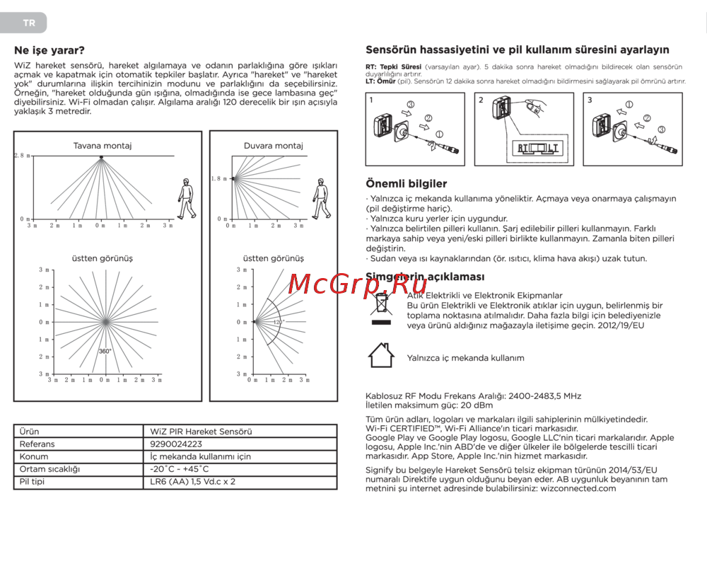 TR Sensörün hassasiyetini ve pil kullanim süresini ayarlayin Ne i e yarar WiZ hareket sensörü hareket algilamaya ve odanin parlakligina göre içiklari açmak ve kapatmak için otomatik tepkiler baslatir Ayrica hareket ve hareket yok durumlarina iliçkin tercihinizin modunu ve parlakligini da seçebilirsiniz Örnegin hareket oldugunda gün içigina olmadiginda ise gece lambasma geç diyebilirsiniz Wi Fi olmadan çaliçir Algilama araligi 120 derecelik bir 15m açisiyla yaklaçik 3 metredir RT Tepki Süresi va sayllan ayar 5 dakna so ra ba ckcl olmaciginl bildireœk clan senstrün duyadiligini arlirn LT Ömür pil Sensörün 12 dakika sonra hareket a ii ini bildirmesini saglayarak pil ömrü iü artini Önemli bilgiler üstten görünüs Yalnizca iç mekanda kullanima yöneliktir Açmaya veya onarmaya çalismayin pil degiçtirme hariç Yalnizca kuru yerler için uygundur Yalnizca belirtilen pilleri kullanin arj edilebilir pilleri kullanmayin Farkli markaya sahip veya yeni eski pilleri birlikte kullanmayin Zamanla biten pilleri degistirin Sudan veya ISI kaynaklanndan or isitici klima hava akisû uzak tutun Simgelerin açiklamasi Atik Elektrikli ve Elektronik Ekipmanlar Bu ürün Elektrikli ve Elektronik atiklar için uygun belirlenmis bir toplama noktasma atilmalidir Daha fazla bilgi için belediyenizle veya ürünü aldiginiz magazayla iletiçime geçin 2012 19 EU Yalnizca iç mekanda kullanim Kablosuz RF Modu Frekans Araligi 2400 2483 5 MHz iletilen maksimum güç 20 dBm Ürün WiZ PIR Hareket Sensörü Referans 9290024223 Konum iç mekanda kullanimi için Ortam sicakligi 20 C 45 С Pil tipi LR6 AA 1 5 Vd C X 2 Tüm ürün adían logolan ve markalari ilgili sahiplerinin mülkiyetindedir Wi Fi CERTIFIED Wi Fi Alliance in ticari markasidir Google Play ve Google Play logosu Google LLC nin ticari markalaridir Apple logosu Apple Inc nin ABD de ve diger ülkeler le bölgelerde tescilli ticari markasidir App Store Apple Inc nin hizmet markasidir Signify bu belgeyle Hareket Sensörü telsiz ekipman türünün 2014 53 EU numarali Direktife uygun oldugunu beyan eder AB uygunluk beyaninin tam metnini su internet adresinde bulabilirsiniz wizconnected com
