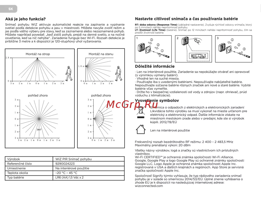 SK Aká je jeho funkcia Nastavte citlivost snímaca a cas pouzívania batérie Snímac pohybu WiZ aktivuje automatické reakcie na zapinanie a vypinanie svetiel podia detekcie pohybu a jasu v miestnosti Môzete navyse zvolit rezim a jas podia vésho vÿberu pre stavy ked sa zaznamená alebo nezaznamená pohyb Môzete napriklad povedat ked zistis pohyb prejdi na denné svetlo a na nocné osvetlenie ked sa nie nehÿbe Zariadenie funguje bez Wi Fi Rozsah detekcie je priblizne 3 metre a k dispozícii je 120 stupñovy uhol vyzarovania RT do ba odozvy Response Time základné nastavetnie vysuje rychlosf odozvy sn maca ktory po 5 m nútach nghlasi neprítomnosf pohybu LT zivotnost Life Time barere Srirrac po 12 m nútach nablási neprítomnosf oohybu cim sa prcdizi zivotrosf bâter e Dôlezité informácie pohl ad zhora pohl ad zhora Len na interiérové pouzitie Zariadenie sa nepokúsajte otváraf aní opravovat s vynimkou vymeny batérií Vhodné len na suche miesta Pouzívajte iba s uvedenymi batériami Nepouzívajte nabíjatelhé batérie Nepouzívajte súcasne batérie róznych znaciek aní nové a staré batérie Vybité batérie veas vymeñte Drzte ho v bezpecnej vzdialenosti od vody a zdrojov napr ohrievac prúd vzduchu z klimatizácie Vysvetlenie symbolov Smernica o odpadoch z elektrickych a elektroníckych zariadení Likvídacia tohto vyrobku sa musí vykonat na míeste urcenom pre elektricky a elektronicky odpad Dalsie informácie získate na miestnom mestskom úrade alebo v predajní kde ste si vyrobok kúpilí 2012 19 EÚ X Len na interiérové pouzitie Frekvencnÿ rozsah bezdrôtového RF rezimu 2 400 2 483 5 MHz Maximâlny prenésanÿ vÿkon 20 dBm Vÿrobok WiZ PIR Snímac pohybu Referencné cislo 9290024223 Umiestnenie Na interiérové pouzitie Teplota okolia 20 C 45 C Typ batérie LR6 AA 1 5 Vdc x 2 Vsetky nézvy vÿrobkov logé a znacky sü vlastnictvom ich prislusnÿch vlastnikov Wi Fi CERTIFIED1 je ochranné znémka spolocnosti Wi Fi Alliance Google Google Play a logo Google Play sû ochranné znémky spolocnosti Google LLC Logo Apple je ochranné znémka spolocnosti Apple Inc registrovanâ v USA a d alsich krajinéch a regiônoch App Store je servisné znacka spolocnosti Apple Inc Spolocnost Signify tÿmto vyhlasuje ze typ rédiového zariadenia snimac pohybu je v sülade so smernicou 2014 53 EÜ Ùplné znenie vyhlésenia o zhode EÜ je k dispozicii na nasledujücej internetovej adrese wizconnected com