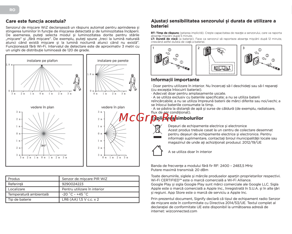 RO Care este functia acestuia Senzorul de miscare WiZ declanseazá un ráspuns automat pentru aprinderea si stingerea luminilorin funche de miscarea detectatá si de luminozitatea íncáperíi De asemenea puteti selecta modul si luminozitatea dorite pentru stárile miscare si tara miscare De exemplu puteti spune treci la luminá naturalá atunci cand exista miscare si la luminá nocturna atunci cánd nu exista Functioneazá tara Wi Fí Intervalul de detectare este de aproximativ 3 metri cu un unghi de distributie luminoasá de 120 de grade Ajustati sensibilitatea senzorului si durata de utilizare a bateriei RT Timp de ráspuns selarea implícita Ciaste capacitates de react e a serzo ului ca e va rapo ta absenta miscár dupa 5 minute LT Durata de viatá a bateriei Face ca senzorul sá aportozo absenta miscá ii dupa 12 minute crc scánd astfel curata ce viatá a oalenci Informatii importante Doar pentru utilizare in interior Nu íncercati sá l deschideti sau sá l reparati cu excepta inlocuírii bateriei Adecvat doar pentru amplasamente uscate A se utiliza exclusiv cu bateriile specificate a nu se utiliza baterii reincá rea bile a nu se utiliza ímpreuná baterii de márci diferite sau noi vechi a se ínlocui bateriile consúmate la timp A se pástra la distantá de apá si surse de cáldurá de exemplu radiatoare flux de aer conditionat Explicarea simbolurilor Deseuri de echipamente electrice si electrónico Acest produs trebuie casat la un centru de colectare desemnat pentru deseuri de echipamente electrice si electronice Pentru informatii suplimentare contactati biroul municipalitátii locale sau magazinul de unde ati achizitionat produsul 2012 19 UE A se utiliza doar în interior Banda de freevençe a modului fárá fir RF 2400 2483 5 MHz Putere maxima transmise 20 dBm Produs Senzor de miscare PIR WiZ Referintá 9290024223 Localizare Pentru utilizare în interior Temperatura ambiéntala 20 C 45 C Tip de baterie LR6 AA 1 5 V c c x 2 Tóate denumirile siglele si márcile produselor apartin proprietarilor respectivi WÍ FÍ CERTIFIED este o marca comercialá a Wi Fi Alliance Google Play si sigla Google Play sunt márci comerciale ale Google LLC Sigla Apple este o marca comercialá a Apple Inc ínregistratá in S U A si în alte tari si regiuní App Store este o marca de serviciu a Apple Inc Prin prezentul document Signify deciará ca tipul de echipament radio Senzor de miscare este în conformitate cu Directiva 2014 53 UE Textul complet al declarare de conformitate UE este disponibiI la urmátoarea adresá de internet wizconnected com