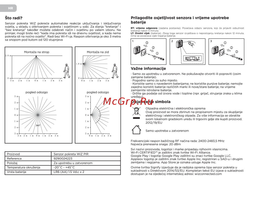 HR Sto radi Senzor pokreta WiZ pokrece automatske reakcije ukljucivanja i iskljucivanja svjetla u skladu s otkrivanjem pokreta i svjetlinom u sobi Za stanja kretanje i bez kretanja takoder mozete odabrati nacin i svjetlinu po vasem izboru Na primjer mogli biste reci kada ima pokreta idi na dnevnu svjetlost a kada nema pokreta idi na nocno svjetlo Radi bez Wi Fi ja Raspón otkrivanja je oko 3 metra sa snopom pod kutom od 120 stupnjeva Prilagodite osjetljivost senzora i vrijeme upotrebe baterije RT vrijeme odgovora zadana ooslavka Povecava odaziv senzora koji ce prijavili odsulnosl krelana nakon 5 minuta LT zivotni vijek baterije Zbcg toga senzor izvjc slava o nepostojan u kretanja nakon 12 muta cime so povecava v ek ajana batonjo Vazne informacije Samo za upotrebu u zatvorenom Ne pokusavajte otvoriti ili popraviti osim zamjene baterije Pogodno samo za suho mjesto Koristite samo s navedenim baterijama ne koristite punjive baterije nemojte zajedno koristiti baterije razlicitih marki ili nove stare baterije na vrijeme zamijenite istrosene baterije Drzite ga podalje od izvora vode i topline npr grijac strujanje zraka u klima uredaju Objasnjenje simbola Otpadna elektricna i elektronicka oprema Ovaj proizvod se mora zbrinuti na propisanom mjestu za skupljanje elektricnog i elektronickog otpada Za vise informacija se obratite svom lokalnom gradskom uredu ili trgovini gdje ste kupili proizvod 2012 19 EU X I i Samo upotreba u zatvorenom Frekvencijski raspon bezicnog RF nacina rada 2400 2483 5 MHz Najveca prenesena snaga 20 dBm Proizvod Senzor pokreta WiZ PIR Referenca 9290024223 Po loza j Za upotrebu u zatvorenom Temperatura okruzenja 20 C 45 C Vrsta baterije LR6 AA 1 5 Vd c x 2 Svi nazivi proizvoda logotipi i marke pripadaju njihovim vlasnicima Wi Fi CERTIFIED je zastitni znak tvrtke Wi Fi Alliance Google Play i logotip Google Play zastitni su znaci tvrtke Google LLC Appleov logotip je zastitni znak tvrtke Apple Inc registriran u SAD u i drugim zemljama i regijama App Store je oznaka usluge Apple Inc Ovime tvrtka Signify izjavljuje da je radijska oprema tipa senzor pokreta u sukladnosti s Direktivom 2014 53 EU Kompletan tekst EU izjave o sukladnosti dostupan je na sljedecoj internetskoj adresi wizconnected com
