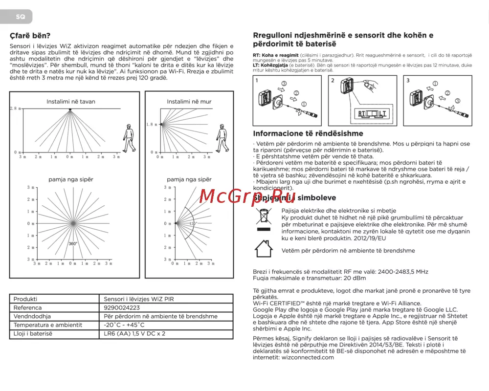 SQ Çfarë bën Sensori lëvizjes WiZ aktivizon reagimet automatike për ndezjen dhe fikjen e dritave sipas zbulimit të lëvizjes dhe ndriçimit në dhomë Mund të zgjidhni po ashtu modalitetin dhe ndriçimin që dëshironi për gjendjet e lëvizjes dhe moslëvizjes Për shembull mund të thoni kaloni te drita e ditës kur ka lëvizje dhe te drita e natës kur nuk ka lëvizje Ai funksionon pa Wi Fi Rrezja e zbulimit është rreth 3 metra me një kënd të rrezes prej 120 gradë Rregulloni ndjeshmërinë e sensorit dhe kohën e përdorimit të baterisë RT Koha e reagimit cilêsim i parezgiechur Rr l reaguesFmêriné e senso it Informacione të rëndësishme Vetëm për përdorim në ambiente të brendshme Mos u përpiqni ta hapni ose ta riparoni përveçse për ndërrimin e baterisë E përshtatshme vetëm për vende të thata Përdoreni vetëm me bateritë e specifikuara mos përdorni bateri të karikueshme mos përdorni bateri të markave të ndryshme ose bateri të reja të vjetra së bashku zëvendësojini në kohë bateritë e shkarkuara Mbajeni larg nga uji dhe burimet e nxehtësisë p sh ngrohësi rryma e ajrit e kondicionerit Shpjegimi i simboleve Pajisja elektrike dhe elektronike si mbetje Ky produkt duhet të hidhet në një pikë grumbullimi të përcaktuar për mbeturinat e pajisjeve elektrike dhe elektronike Për më shumë informacione kontaktoni me zyrën lokale të qytetit ose me dyqanin ku e keni blerë produktin 2012 19 EU Vetëm për përdorim në ambiente të brendshme Brezi i frekuencës së modalitetit RF me valë 2400 2483 5 MHz Fuqia maksimale e transmetuar 20 dBm Produkti Sensori i lëvizjes WiZ PIR Referenca 9290024223 Vendndodhja Për përdorim në ambiente të brendshme Temperatura e ambientit 20 C 45 C Lloji i baterisë LR6 AA 1 5 V DC x 2 Të gjitha emrat e produkteve logot dhe markat janë pronë e pronarëve të tyre përkatës Wi Fi CERTIFIED është një markë tregtare e Wi Fi Alliance Google Play dhe logoja e Google Play janë marka tregtare të Google LLC Logoja e Apple është një markë tregtare e Apple Inc e regjistruar në Shtetet e bashkuara dhe në shtete dhe rajone të tjera App Store është një shenjë shërbimi e Apple Inc Përmes kësaj Signify deklaron se lloji i pajisjes së radiovalëve i Sensorit të lëvizjes është në përputhje me Direktivën 2014 53 BE Teksti i plotë i deklaratës së konformitetit të BE së disponohet në adresën e mëposhtme të internetit wizconnected com