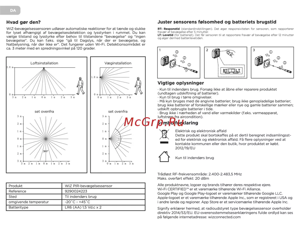 Hvad gor den Juster sensorens folsomhed og batteriets brugstid WiZ bevasgelsessensoren udloser automatiske reaktioner for at teende og slukke for lyset afhasngigt af bevasgelsesdetektion og lysstyrken i rummet Du kan vaelge tilstand og lysstyrke etter behov til tilstandene bevaegelse og ingen bevaegelse Du kan f eks sige gä til Dagslys när der er bevaegelse og Natbelysning när der ikke er Det fungerer uden Wi Fi Detektionsomrädet er ca 3 meter med en spredningsvinkel pä 120 grader RT Responstid stenda d ncst Hingen Del ager esponsiv leier for Sensoren so apporle er f avæ ai bevaegelse eiter 5 minutler LT Levetid fcv balleriel Del fär sensoren Lil at rapportera iravær af bevægelse efler 12 minutler og oger deuned batlerileveliden Vigtige oplysninger Kun til indendors brug Forsog ikke at abne eller reparere produktet undtagen udskiftning af batterier Kun til brug i torre omgivelser Mä kun bruges med de angivne batterier brug ikke genopiadelige batterier brug ikke batterier af forskellige maerker eller nye og gamle batterier sammen udskift opbrugte batterier i tide Brug ikke i naerheden af vand eller varmekilder f eks varmeapparat luftstrom fra aircondition Symbolforklaring EIektrisk og elektronisk affald Dette produkt skal bortskaffes pä et dertil beregnet indsamlingssted for elektrisk og elektronisk affald Fä fiere oplysninger ved at kontakte kommunen eller den butik hvor produktet er kobt 2012 19 EU X Kun til indendors brug Trädlost RF frekvensomräde 2 400 2 483 5 MHz Maks overfort effekt 20 dBm Produkt WiZ PIR bevægelsessensor Reference 9290024223 Sted Til indendors brug omgivende temperatur 20 C 45 C Batteritype LR6 AA 1 5 Vd c x 2 Alle produktnavne logoer og brands tilhorer deres respektive ejere Wi Fi CERTIFIED er et varemærke tilhorende Wi Fi Alliance Google Play og Google Play Iogoet er varemærker tilhorende Google LLC Apple Iogoet er et varemærke tilhorende Apple Inc som er registreret i USA og i andre lande og regioner App Store er et servicemærke tilhorende Apple Inc Signify erklærer hermed at radioudstyret type bevaegelsessensor overholder direktiv 2014 53 EU EU overensstemmelseserklaeringens fulde ordlyd kan ses pä folgende internetadresse wizconnected com