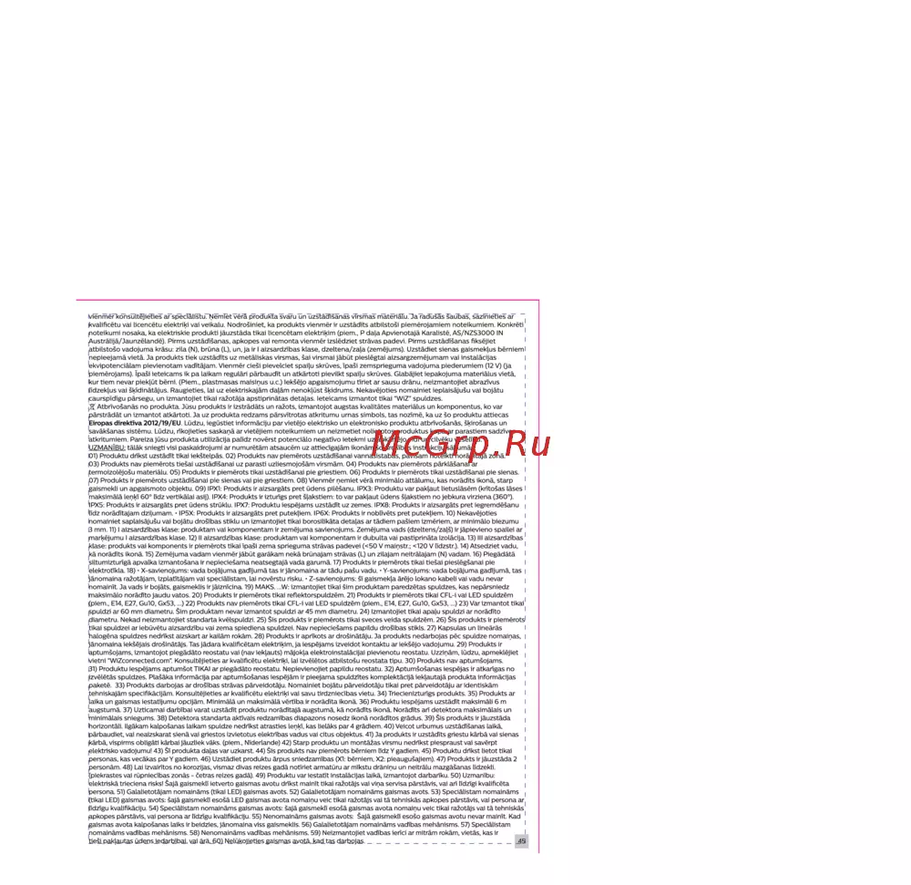eiTmer konsultejieties ar specialistu Nemiet verä produkta sväru un uzstädilanasvirsmäs rhatefiälü Ja radusäs saubas sazinieties ar I kvalificetu vai licencetu elektriki vai veikalu Nodrosiniet ka Produkts vienmer ir uzstädits atbilstosi piemerojamiem noteikumiem Konkreti i noteikumi nosaka ka elektriskie produkti jäuzstäda tikai licencetam elektrikim piem P dala Apvienotajä Karaliste AS NZS3000 IN Austrälijä Jaunzelande Pirms uzstädisanas apkopes vai remonta vienmer izsledziet strävas padevi Pirms uzstädisanas fiksejiet latbilstoso vadojuma krasu zila N bruna L un ja ir I aizsardzibas klase dzeltena zala zemejums Uzstadiet sienas gaismeklus berniem Inepieejamä vietä Ja Produkts tiek uzstädits uz metäliskas virsmas sai virsmai jäbüt pieslegtai aizsargzemejumam vai instaläcijas lekvipotenciälam pievienotam vadltäjam Vienmer ciesi pievelciet spailu skrüves 1pasi zemsprieguma vadojuma piederumiem 12 V ja piemerojams Tpasi ieteicams ik pa laikam reguläri pärbaudTt un atkärtoti pievilkt spailu skrüves Glabäjiet iepakojuma materiälus vietä 1 kur tiem nevar pieklüt berni Piem plastmasas maisinus u c leksejo apgaismojumu tiriet ar sausu dränu neizmantojiet abrazivus lidzek lus vai skidinatajus Raugieties lai uz elek triskajam dalam nenoklust skidrums Mekavejoties nomainiet ieplaisajusu vai bojatu caurspidigu pärsegu un izmantojiet tikai razotäja apstiprinätas detalas Ieteicams izmantot tikai WiZ spuldzes 1S Atbrivosanäs no produkta Jüsu Produkts ir izsträdäts un razots izmantojot augstas kvalitätes materiälus un komponentus ko var Ipärsträdät un izmantot atkärtoti Ja uz produkta rcdzams pärsvltrotas atkritumu urnas simbols tas nozimc ka uz so produktu atticcas lEiropas direktiva 2012 19 EU Lüdzu iegüstiet informäciju par vietejo elektrisko un elektronisko produktu atbrivosanäs skirosanas un isaväk sanas sistemu Lüdzu rikojieties saskanä ar vietejiem noteikumiem un neizmetiet nolietotos produktus kopä ar parastiem sadzlves latkritumiem Pareiza jüsu produkta utilizäcija palidz noverst potenciälo negativo ietekmi uz apkärtejo vidi un cilveku veselibu UZMANTBU täläk sniegti visi paskaidrojumi ar numuretäm atsaucem uz attiecigajäm ikonäm so drosibas instrukciju säkumä 01 Produktu drikst uzstädTt tikai ickstclpäs 02 Produkts nav picmcrots uzstädisanai vannasistabäs pavisam notcikti noräditajä zonä 03 Produkts nav piemerots tiesai uzstädisanai uz parasti uzliesrnojosäm virsmäm 04 Produkts nav piemerots pärklasanai ar termoizolejosu materiälu 05 Produkts ir piemerots tikai uzstädisanai pie griestiem 06 Produkts ir piemerots tikai uzstädisanai pie sienas 07 Produkts ir piemerots uzstädisanai pie sienas vai pie griestiem 08 Vienmer nemiet verä minimälo attälumu kas norädlts ikonä starp Igaismekli un apgaismoto objektu 09 IPX1 Produkts ir aizsargäts pret üdens pilesanu IPX3 Produktu var paklaut lietusläsem kritosas läses Imaksimälä lenkt 60 I1dz vcrtikälai asij IPX4 Produkts ir izturigs prct slaksticm to var paklaut üdens slaksticm no jebkura virzicna 360 lPX5 Produkts ir aizsargäts pret üdens strüklu IPX7 Produktu iespejams uzstädit uz zemes IPX8 Produkts ir aizsargäts pret iegrerndesanu Udz noräditajam dzilumam IP5X Produkts ir aizsargäts pret putekliem IP6X Produkts ir nobllvets pret putek liem 10 Nekavejoties pomainiet saplaisäjusu vai bojätu drosibas stiklu un izmantojiet tikai borosilikäta detalas ar tädiem pasiem izmeriem ar minimälo biezumu I 3 mm 11 I aizsardzibas klase produktam vai komponentam ir zemejuma savienojums Zemejuma vads dzeltens zals ir jäpievieno spailei ar I markejumu I aizsardzibas klase 12 II aizsardzibas klase produktam vai komponentam ir dubulta vai pastiprinäta izoläcija 13 III aizsardzibas klase Produkts vai komponents ir piemerots tikai 1pasi zema sprieguma strävas padevei 50 V mainstr 120 V tldzstr 14 Atsedziet vadu Ikä norädlts ikonä 15 Zemejuma vadam vienmer jäbüt garäkam nekä brünajam strävas L un zilajam neiträlajam N vadam 16 Piegädätä Isiltumizturlgä apvalka izmantosana ir nepieciesama neatsegtajä vada garumä 17 Produkts ir piemerots tikai tiesai pieslegsanai pie lelektrotlkla 18 X savienojums vada bojäjuma gadljumä tas ir jänomaina ar tädu pasu vadu Y savienojums vada bojäjuma gadljumä tas jänomaina razotäjam izplatltäjam vai speeiälistam lai noverstu risku Z savicnojums s1 gaismekla ärejo lokano kabcli vai vadu nevar inomainit Ja vads ir bojäts gaismeklis ir jäiznlcina 19 MAKS W izmantojiet tikai sim produktam paredzetas spuldzes kas neparsniedz 1 aksimälo norädlto jauduvatos 20 Produkts ir piemerots tikai reflektorspuldzem 21 Produkts ir piemerots tikai CFL i vai LEO spuldzem I piem E14 E27 GulO Gx53 22 Produkts nav piemerots tikai CFL i vai LED spuldzem piem E14 E27 GulO Gx53 23 Var izmantot tikai spuldzi ar 60 mm diametru Sim produktam nevar izmantot spuldzi ar 45 mm diametru 24 Izmantojiet tikai apalu spuldzi ar norädlto diametru Nckad neizmantojiet standarta kvclspuldzi 25 Sis Produkts ir picmcrots tikai svcccs veida spuldzem 26 Sis Produkts ir piemerots Itikai spuldzei ar iebüvetu aizsardzibu vai zema spiediena spuldzei Nav nepieciesams papildu drosibas stikls 27 Kapsulas un lineäräs ihalogena spuldzes nedrikst aizskart ar kailäm rokäm 28 Produkts ir aprikots ar drosinätäju Ja Produkts nedarbojas pec spuldze nomainas jänomaina ieksejais drosinätäjs Tas jädara kvalificetam elektrikim ja iespejams izveidot kontaktu ar ieksejo vadojumu 29 Produkts ir laptumsojams izmantojot piegädäto reostatu vai nav ieklauts mäjokla elektroinstaläcijai pievienotu reostatu Uzzinäm lüdzu apmeklejiet 1 Vietni WiZconnected com Konsultejieties ar kvalificetu elektriki lai izveletos atbilstosu reostata tipu 30 Produkts nav aptumsojams 31 Produktu iespejams aptumsot TIKAI ar piegadato reostatu Nepievienojiet papildu reostatu 32 Aptumsosanas iespejas ir atkangas no i izveletäs spuldzes Plasäka informäcija par aptumsosanas iesp