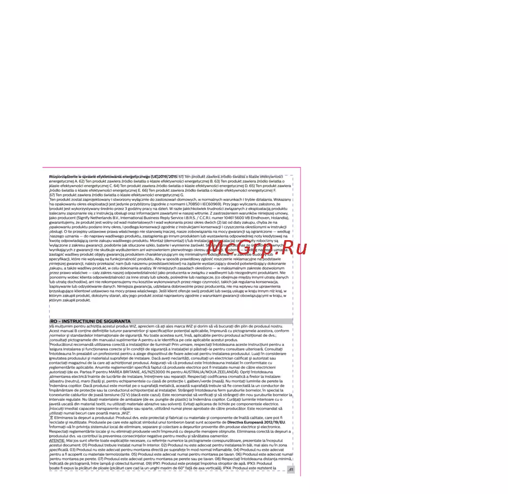 Rozporzadzenie wsprawie etykietowaniaenergetyczriegö JEJ2O19 2O15 61 TerTprödükfzawierazrodtdswfaflaoklasieefektywnösci energetycznej A 62 Ten Produkt zawiera zrödlo swiatla o klasie efektywnosci energetycznej B 63 Ten Produkt zawiera zrödlo swiatla o klasie efektywnosci energetycznej C 64 Ten produkt zawiera zrödlo swiatla o klasie efektywnosci energetycznej D 65 Ten produkt zawiera zrödlo swiatla o klasie efektywnosci energetycznej E 66 Ten produkt zawiera zrödlo swiatla o klasie efektywnosci energetycznej F 167 Ten produkt zawiera zrödlo swiatla o klasie efektywnosci energetycznej G Ten produkt zostal zaprojektowany i stworzony wyl cznie do zastosowan domowych w normalnych warunkach i trybie dzialania Wskazany ina opakowaniu okres eksploatacji jest jedynie przyblizony zgodnie z normami L7OB5O i IEC60969 Przy jego wyliczaniu zalozono ze produkt jest wykorzystywany srednio przez 3 godziny pracy na dzien W razie jakichkolwiek trudnosci zwiazanych z eksploatacja produktu jzalecamy zapoznanie si z instrukcja obslugi oraz informacjami zawartymi w naszej witrynie Z zastrzezeniern warunkow niniejszej umowy jako producent Signify Netherlands B V International Business Reply Service I B R S C C R I numer 104615600 VB Eindhoven Holandia gwarantujemy ze produkt jest wolny od wad materialowych i wad wykonania przez okres dwöch 2 lat od daty zakupu chyba ze na opakowaniu produktu podano inny okres i podlega konserwacji zgodnie z instrukcjami konserwacji i czyszczenia okreslonymi w instrukcji obslugi O ile przepisy ustawowe prawa wlasciwego nie stanowi inaczej nasze zobowi zania na mocy gwarancji sq ograniczone wedlug Inaszego uznania do naprawy wadliwego produktu zast pienia go innym produktem lub wystawienia odpowiedniej noty kredytowej na kwote odpowiadaj c cenie zakupu wadliwego produktu Montaz demontaz i lub instalacja deinstalacja oraz koszty robocizny s wylaczone z zakresu gwarancji podobnie jak stluczone szklo baterie i wymienne zarowki Skorzystanie przez nas ze srodkow prawnych wynikaj cych z gwarancji nie skutkuje wydluzeniem ani wznowieniem pierwotnego okresu gwarancji Mozemy wedlug naszego uznania zastapic wadliwy produkt objpty gwarancji produktem charaktcryzujqcym sip minimalnymi odstppstwami w zakresic budowy lub specyfikacji klöre nie wplywaj na funkcjonalnosc produktu Aby w sposöb prawidlowy zglosic roszczenie reklamacyjne na podstawie niniejszej gwarancji nalezy przekazac nam lub naszemu przedstawicielowi na z danie wystarczaj cy dowöd potwierdzaj cy dokonanie zakupu a takze wadliwy produkt w celu dokonania analizy W niniejszych zasadach okreslono w maksymalnym zakresie dozwolonym Iprzez prawo wlasciwe caly zakres naszej odpowiedzialnosci jako producenta w zwigzku z wadliwymi lub niezgodnymi produktami Nie ponosimy wobcc klicnta odpowiedzialnosci za inne straty lub szkody posrcdnic lub nastppczc co obejmuje mipdzy innymi utratq danych Jub utrat dochodöw ani nie rekompensujemy mu kosztöw wykonywanych przez niego czynnosci takich jak regularna konserwaeja zapisywanie lub odzyskiwanie danych Niniejsza gwaraneja udzielana dobrowolnie przez producenta nie ma wptywu na uprawnienia przysluguj ce klientowi ustawowo na mocy prawa wlasciwego Jesli klient oferuje swöj produkt lub swoj uslug w kraju innym niz kraj w ktörym zakupil produkt dolozymy starah abyjego produkt zostal naprawiony zgodnie z warunkami gwarancji obowiazujacymi w kraju w ktörym zakupil produkt RO INSTRUCTIUNI DE SIGURANTA va multumim pentru achizitia acestui produs WiZ apreciem cá ati ales marca WiZ si dorim sá vá bucurati din plin de produsul nostru Acest manual B contine definitiile tuturor parametrilor i specificatiilor potentíal aplicabile ímpreuná cu pictogramele acestora conform Inormelor si standardelor Internationale de sigurantá Nu tóate acestea sunt ínsá aplicabile pentru produsul achizitionat de dvs Iconsultati pictogramele din manualul suplimentar A pentru a le identifica pe cele aplicabile acestui produs producatorul recomandá utilizarea corectá a instalatiilor de iluminad Prin urmare respectad íntotdeauna aceste instructiuni pentru a jasigura instalarea si functionarea corecte si ín conditii de sigurantá a instalatiei si pástrati le pentru consultare ulterioará Consultad íntotdeauna ín prealabil un profesionist pentru a alege dispozitivul de fixare adecvat pentru instalarea produsului Luati ín considerare greutatea produsului ji materialul suprafetei de instalare Dacá aveti neclaritáti consultad un electrician calificat ji autorizat sau contactad magazinul de la care ati achizitionat produsul Asigurati vá cá produsul este íntotdeauna instalat ín conformitate cu reglementárile aplicabile Anumíte reglementari specifica faptul ca produsele electrice pot fi instálate numai de catre electricieni autorizad de ex Partea P pentru MAREA BRITANIE AS NZS3000 IN pentru AUSTRALIA NOUA ZEELANDÁ Opriti íntotdeauna lalimentarea eléctrica ínainte de lucrárile de instalare íntretinere sau reparatii Respectad codificarea cromatica a firelor la instalare lalbastru neutru maro fazá i pentru echipamentele cu clasá de protectie I galben verde masa Nu montad luminile de perete la jindemána copiilor Dacá produsul este montat pe o suprafatá metálica aceastá suprafatá trebuie sá ñe conectatá la un conductor de ímpárnántare de protectie sau la conductorul echipotential al instalatiei Strángeti íntotdeauna ferm suruburile bornelor ín special la Conexiunile cablurilor de joasá tensiune 12 V dacá este cazul Este recomandat sá verificad i sá strángeti din nou suruburile bornelor la intervale regúlate Nu lásati materialele de ambalare de ex pungile de plástic laíndemánacopiilor Curátati luminile interioare cu o lavetá uscatá din material textil nu utilizad materiale abrazive sau solventi Evitad aplicarea de lichide pe componentele electrice ínlocuiti imediat capacele transparente crápate sau sparte utilizand numai piese aprobate de catre producátor Este re