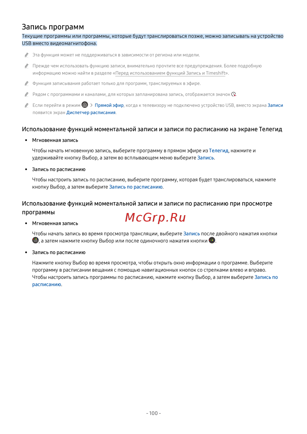 - Использование функций моментальной записи и записи по расписанию на экране телегида p.256