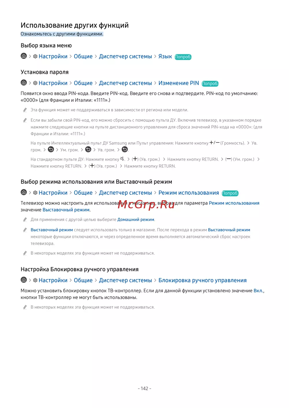 Samsung Neo QLED 4K Smart TV QE65QN87BAU — настройки телевизора: управление PIN-кодом и режимами использования [142/264]