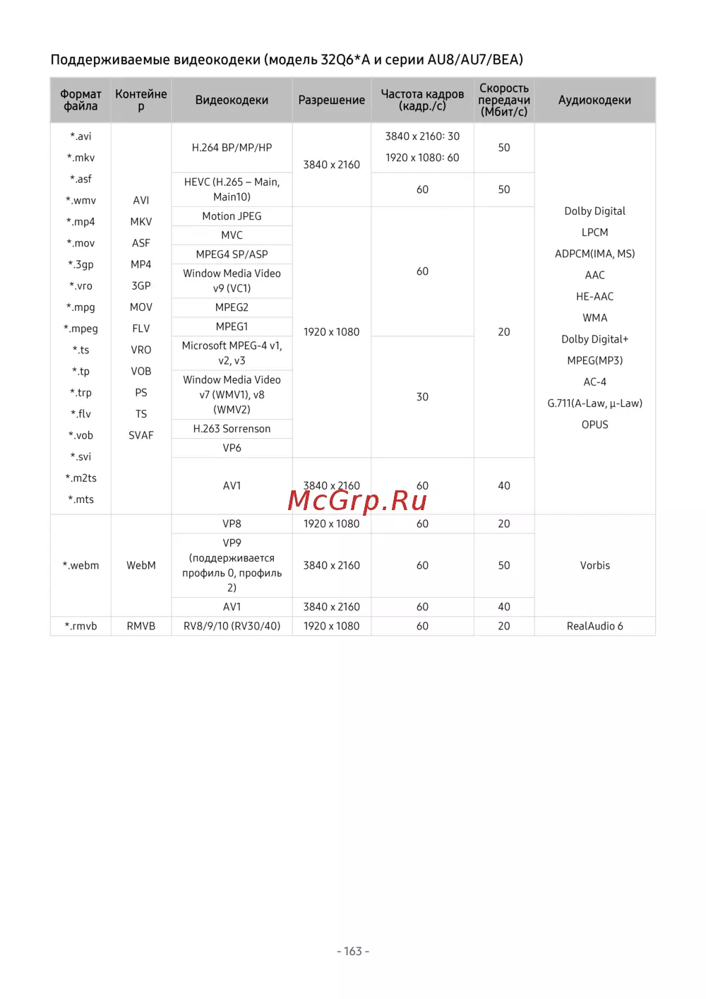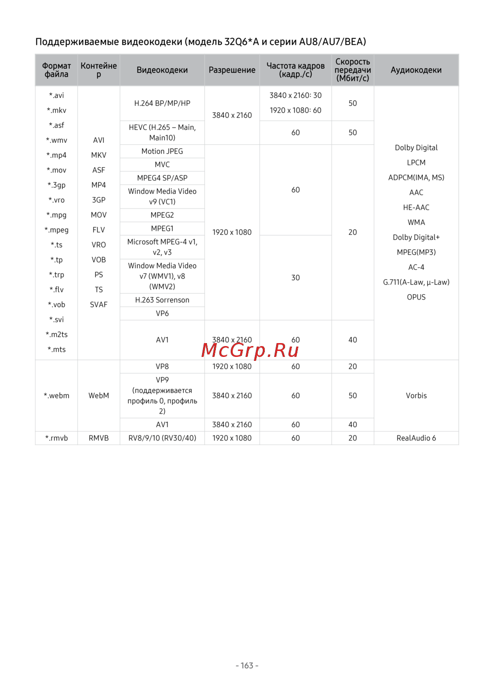 Поддерживаемые видеокодеки (модель 32Q6*A и серии AU8/AU7/BEA)