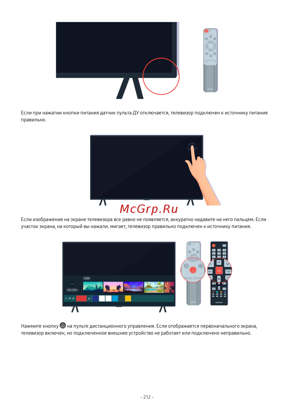 - Снова проверьте датчик пульта ду если индикатор горит нажмите кнопку питания на пульте ду чтобы включить телевизор p.211