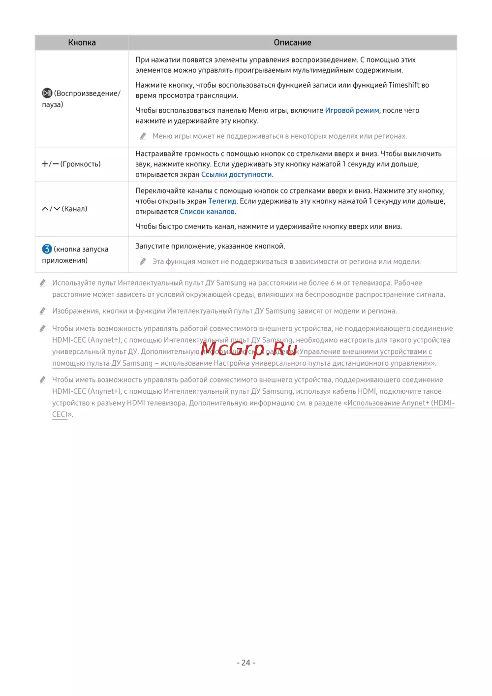 Изображения, кнопки и функции Интеллектуальный пульт ДУ Samsung зависят от модели и региона.
