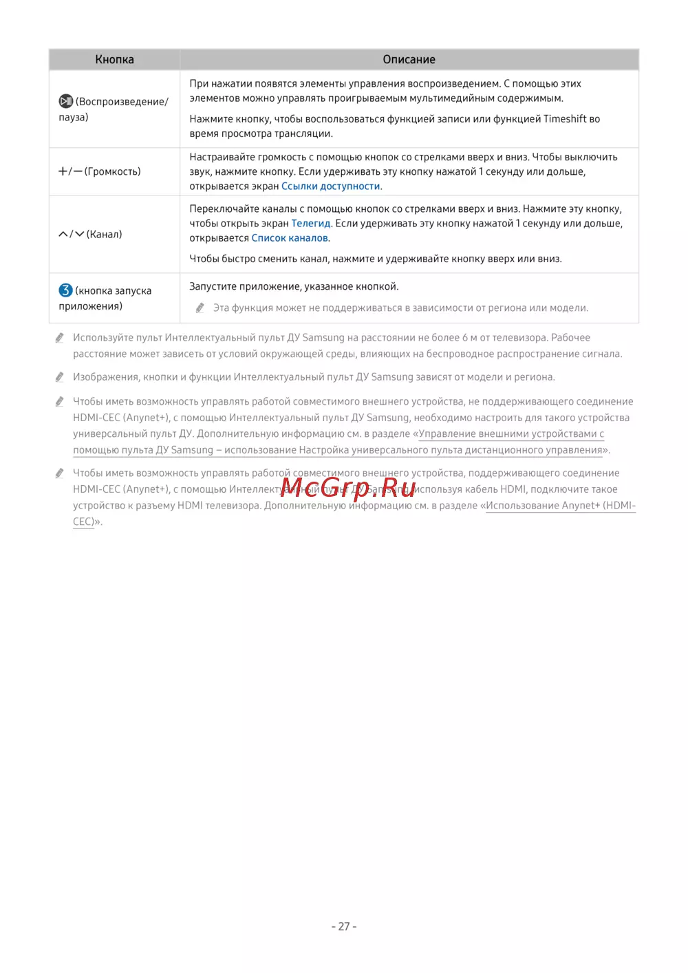 Изображения, кнопки и функции Интеллектуальный пульт ДУ Samsung зависят от модели и региона.