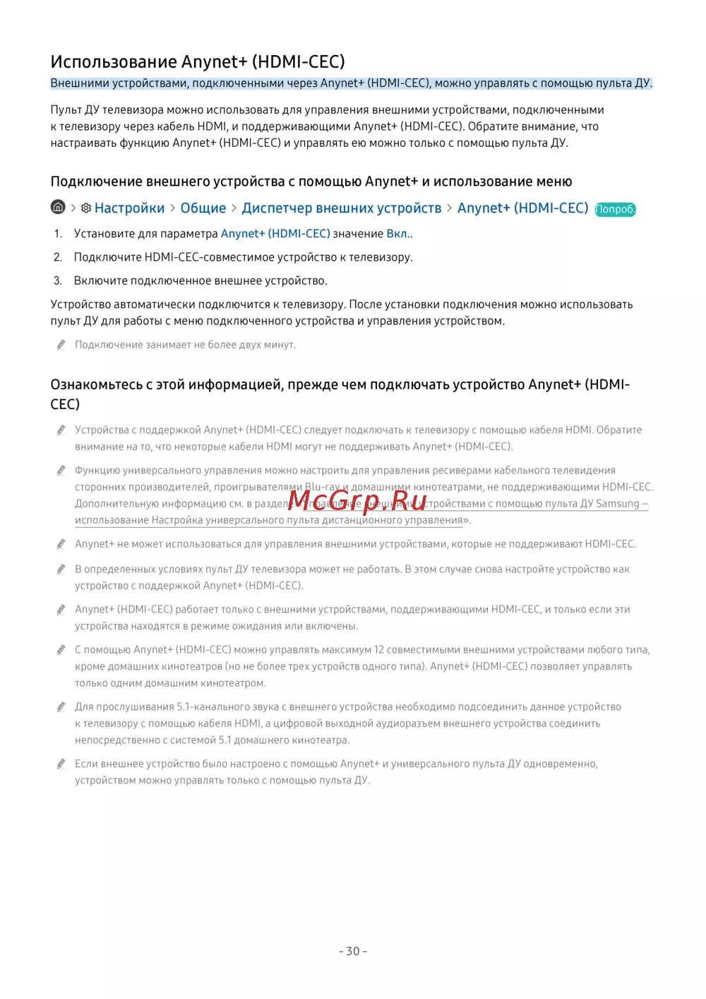 настраивать функцию Anynet+ (HDMI-CEC) и управлять ею можно только с помощью пульта ДУ.