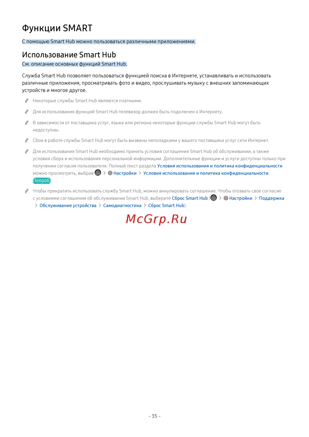 Для использования Smart Hub необходимо принять условия соглашения Smart Hub об обслуживании, а также
