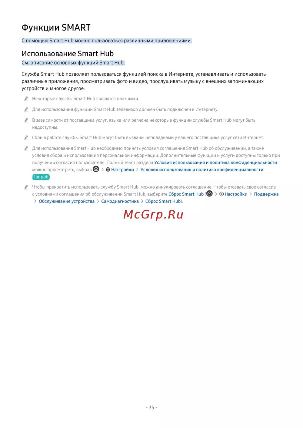 В зависимости от поставщика услуг, языка или региона некоторые функции службы Smart Hub могут быть