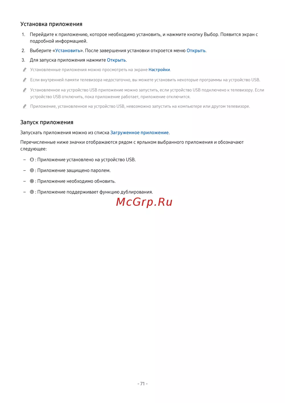 Установленное на устройство USB приложение можно запустить, если устройство USB подключено к телевизору. Если