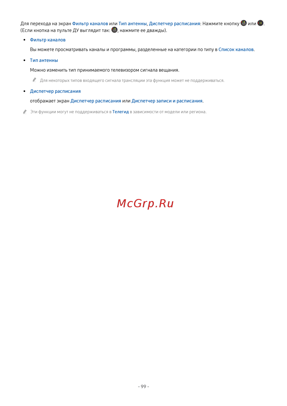 Для перехода на экран Фильтр каналов или Тип антенны, Диспетчер расписания: Нажмите кнопку или .