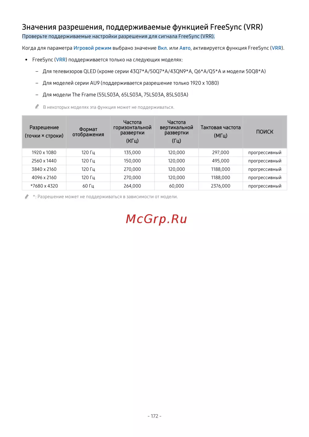 Значения разрешения, поддерживаемые функцией FreeSync (VRR)