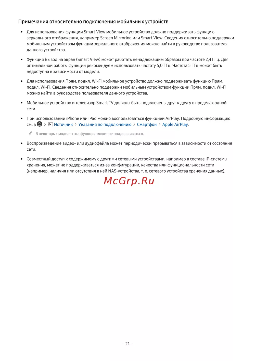 • При использовании iPhone или iPad можно воспользоваться функцией AirPlay. Подробную информацию