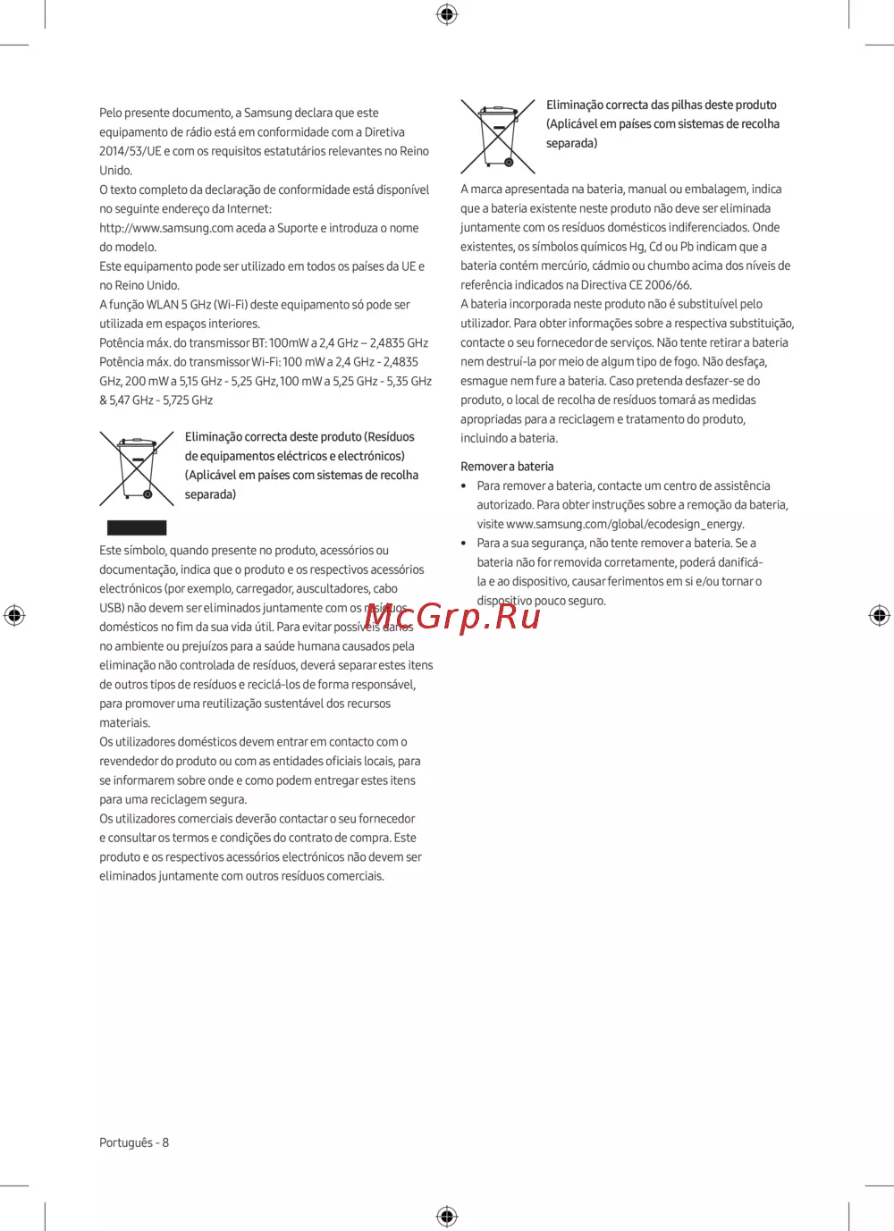 que a bateria existente neste produto não deve ser eliminada