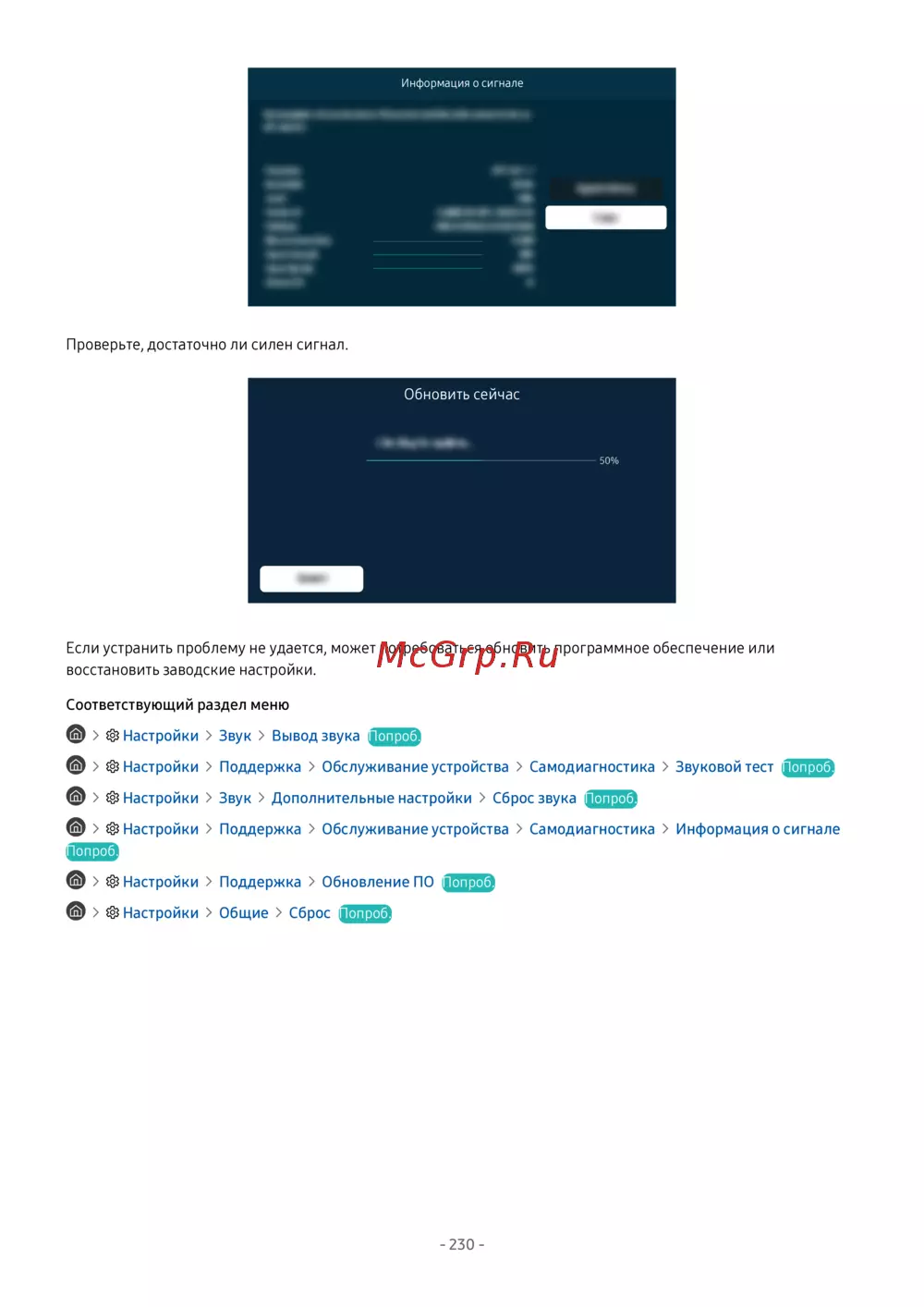 - Обновление до последней версии программного обеспечения телевизора p.235