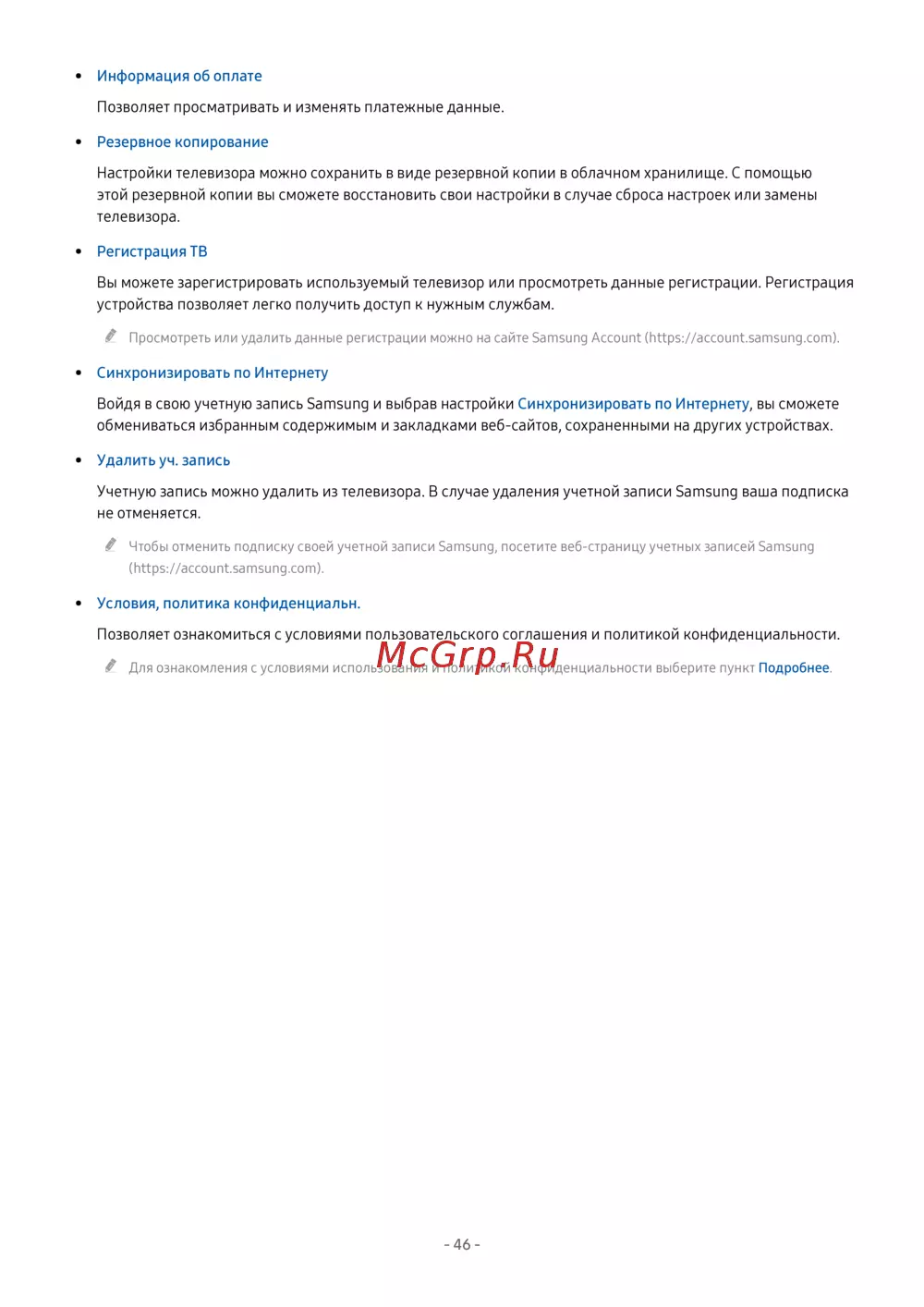 Узнайте, как управлять платежными данными, резервировать настройки телевизора и регистрировать устройство. Получите доступ к важным функциям и услугам.