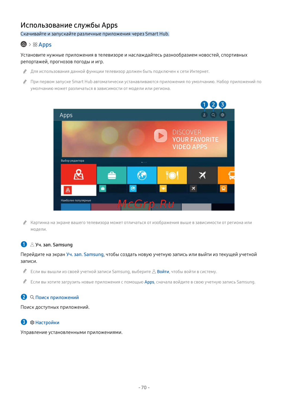 При первом запуске Smart Hub автоматически устанавливаются приложения по умолчанию. Набор приложений по