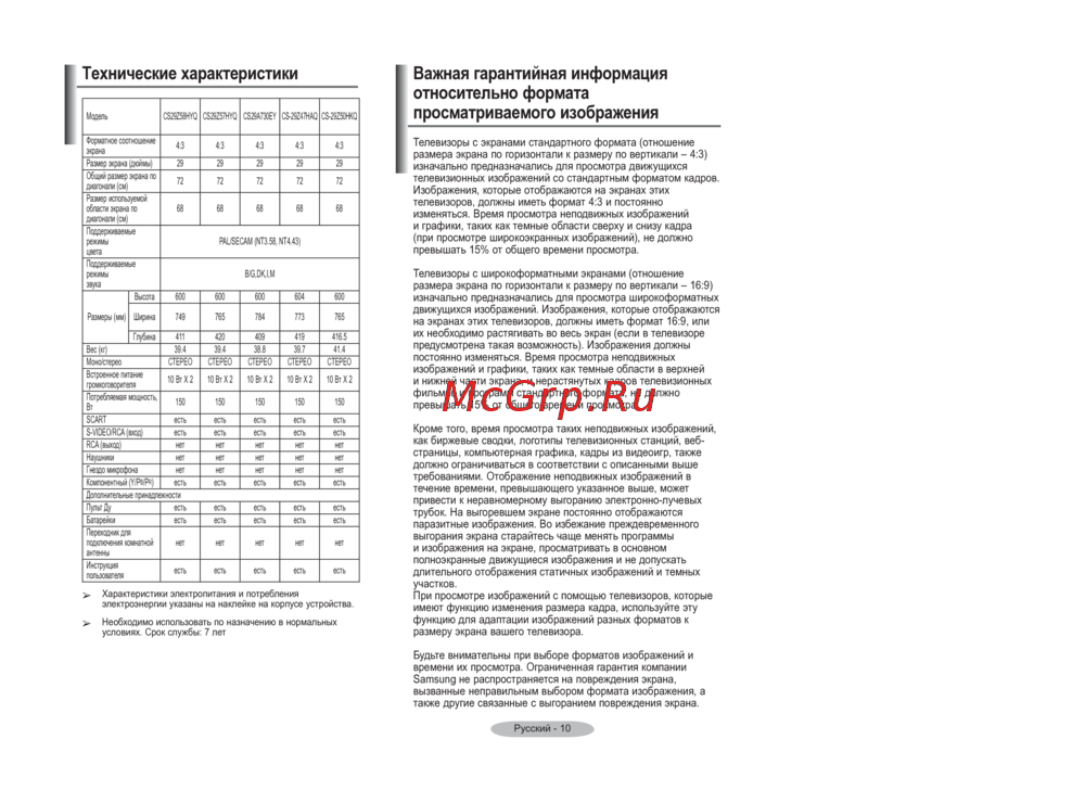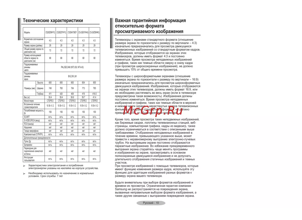 - Кроме того время просмотра таких неподвижных изображений как биржевые сводки логотипы телевизионных станций веб страницы компьютерная графика кадры из видеоигр также должно ограничиваться в соответствии с описанными выше требованиями отображение неподвижных изображений в течение времени превышающего указанное выше может привести к неравномерному выгоранию электронно лучевых трубок на выгоревшем экране постоянно отображаются паразитные изображения во избежание преждевременного выгорания экрана старайтесь чаще менять программы и изображения на экране просматривать в основном полноэкранные движущиеся изображения и не допускать длительного отображения статичных изображений и темных участков при просмотре изображений с помощью телевизоров которые имеют функцию изменения размера кадра используйте эту функцию для адаптации изображений разных форматов к размеру экрана вашего телевизора p.11