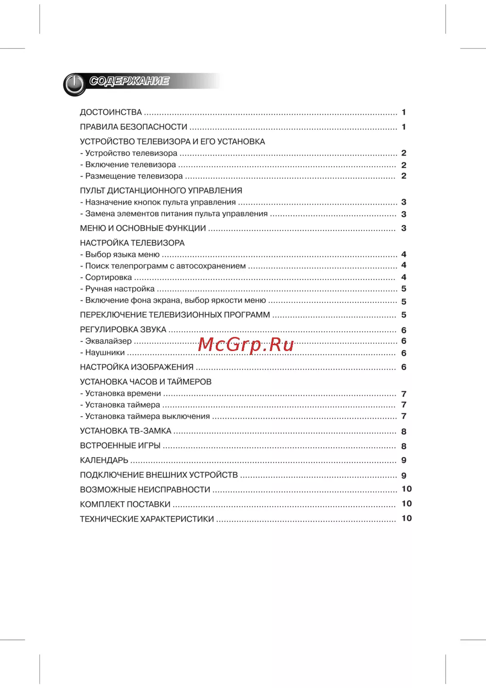 ДОСТОИНСТВА 1 ПРАВИЛА БЕЗОПАСНОСТИ 1 УСТРОЙСТВО ТЕЛЕВИЗОРА И ЕГО УСТАНОВКА Устройство телевизора 2 Включение телевизора 2 Размещение телевизора 2 ПУЛЬТ ДИСТАНЦИОННОГО УПРАВЛЕНИЯ Назначение кнопок пульта управления 3 Замена элементов питания пульта управления 3 МЕНЮ И ОСНОВНЫЕ ФУНКЦИИ 3 НАСТРОЙКА ТЕЛЕВИЗОРА Выбор языка меню 4 Поиск телепрограмм с автосохранением 4 Сортировка 4 Ручная настройка 5 Включение фона экрана выбор яркости меню 5 ПЕРЕКЛЮЧЕНИЕ ТЕЛЕВИЗИОННЫХ ПРОГРАММ 5 РЕГУЛИРОВКА ЗВУКА 6 Эквалайзер 6 Наушники 6 НАСТРОЙКА ИЗОБРАЖЕНИЯ 6 УСТАНОВКА ЧАСОВ И ТАЙМЕРОВ Установка времени 7 Установка таймера 7 Установка таймера выключения 7 УСТАНОВКА ТВ ЗАМКА 8 ВСТРОЕННЫЕ ИГРЫ 8 КАЛЕНДАРЬ 9 ПОДКЛЮЧЕНИЕ ВНЕШНИХ УСТРОЙСТВ 9 ВОЗМОЖНЫЕ НЕИСПРАВНОСТИ 10 КОМПЛЕКТ ПОСТАВКИ 10 ТЕХНИЧЕСКИЕ ХАРАКТЕРИСТИКИ 10