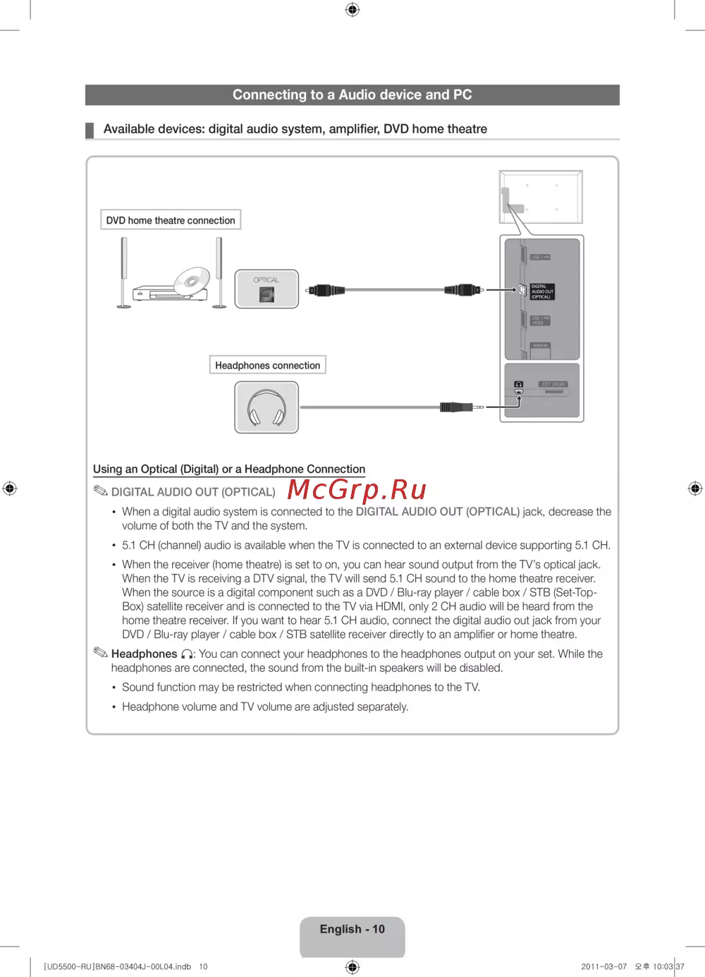 Using an Optical (Digital) or a Headphone Connection
